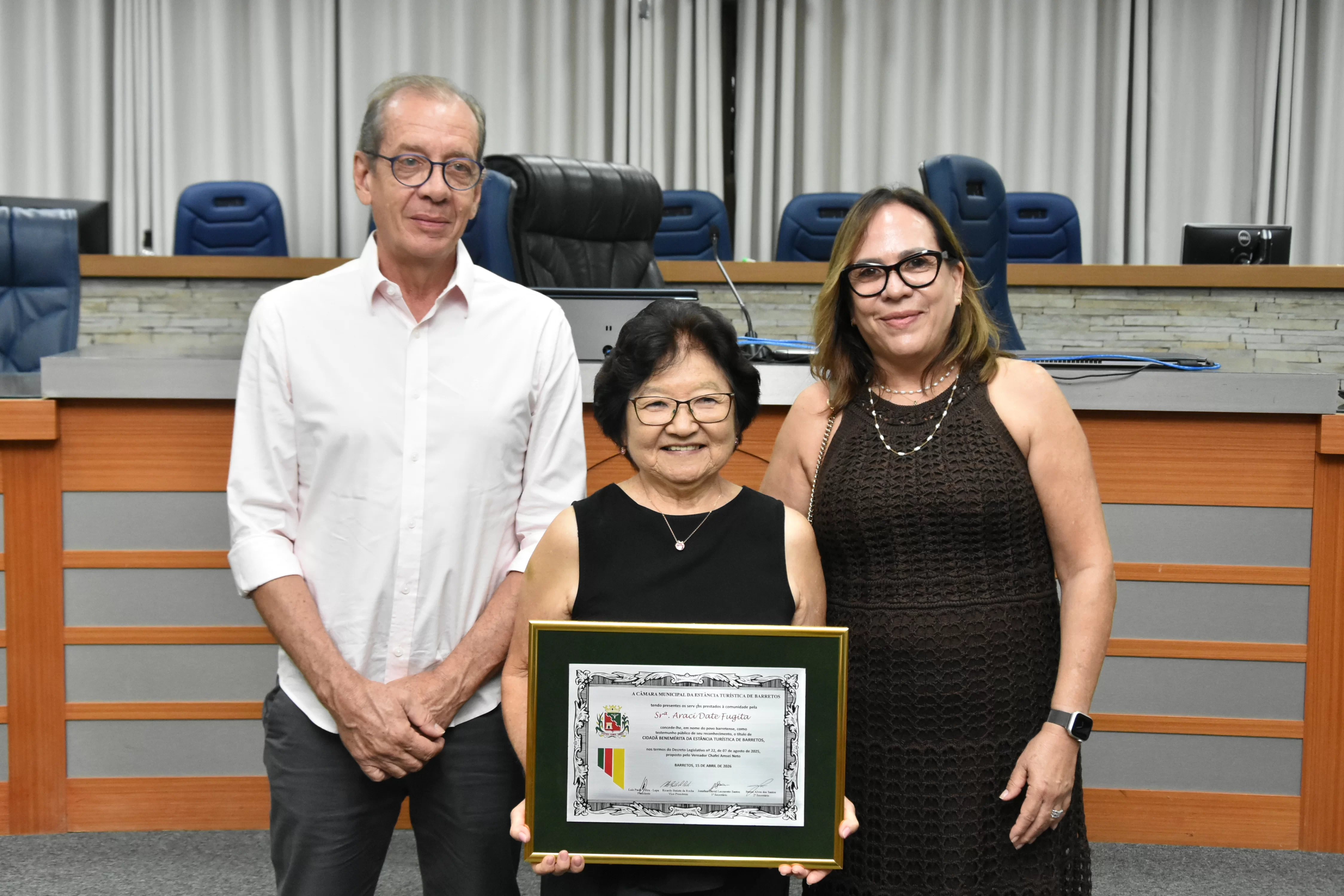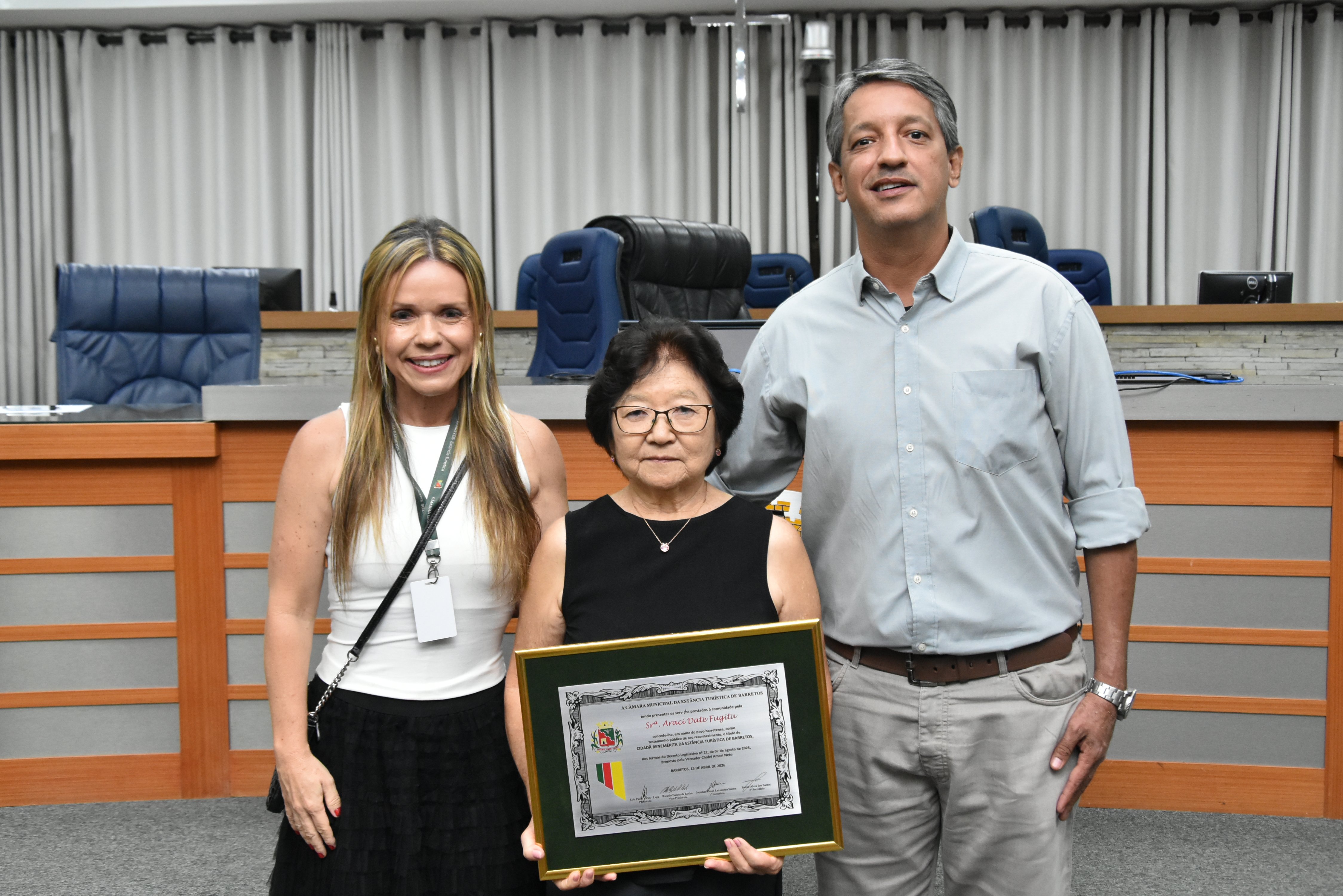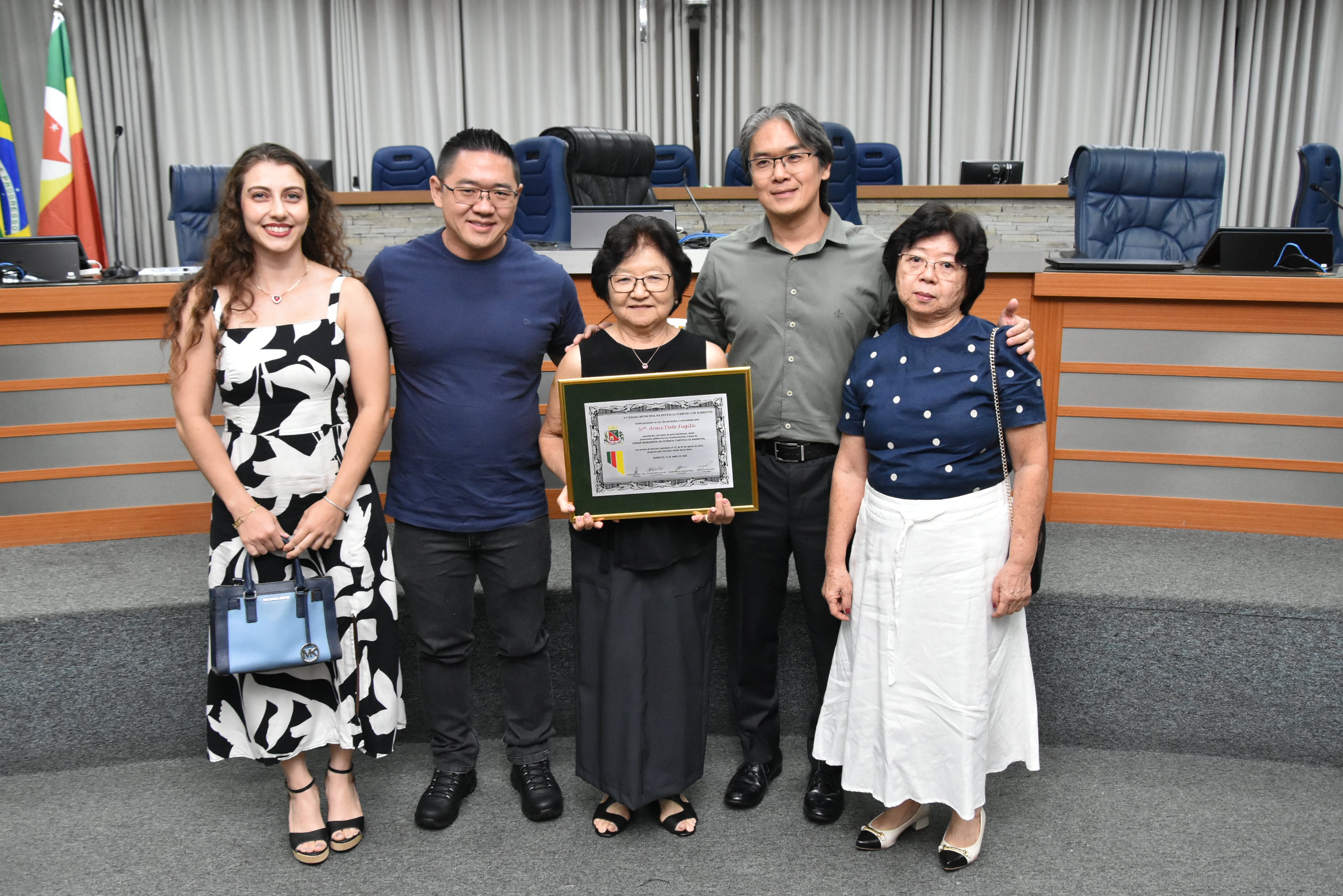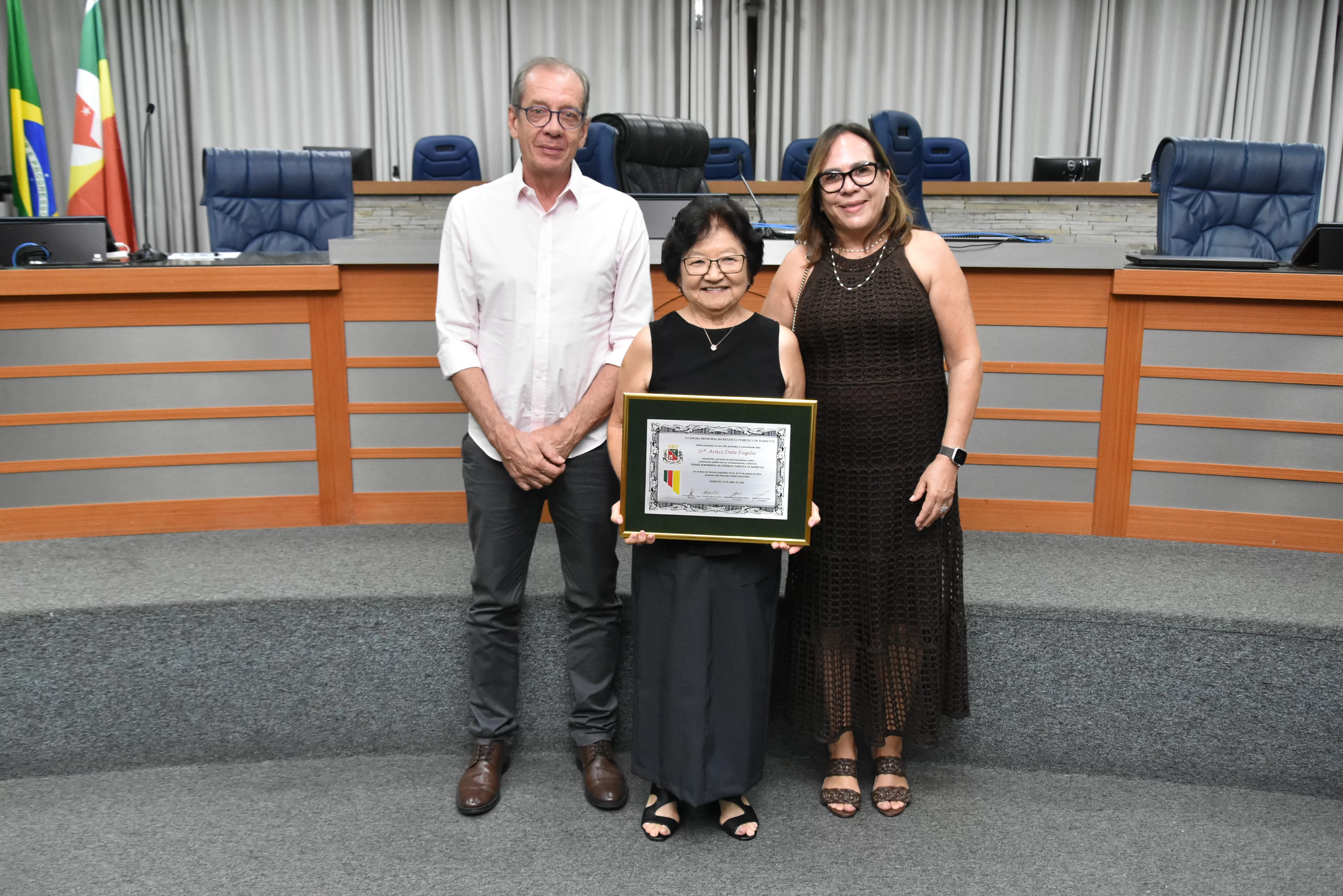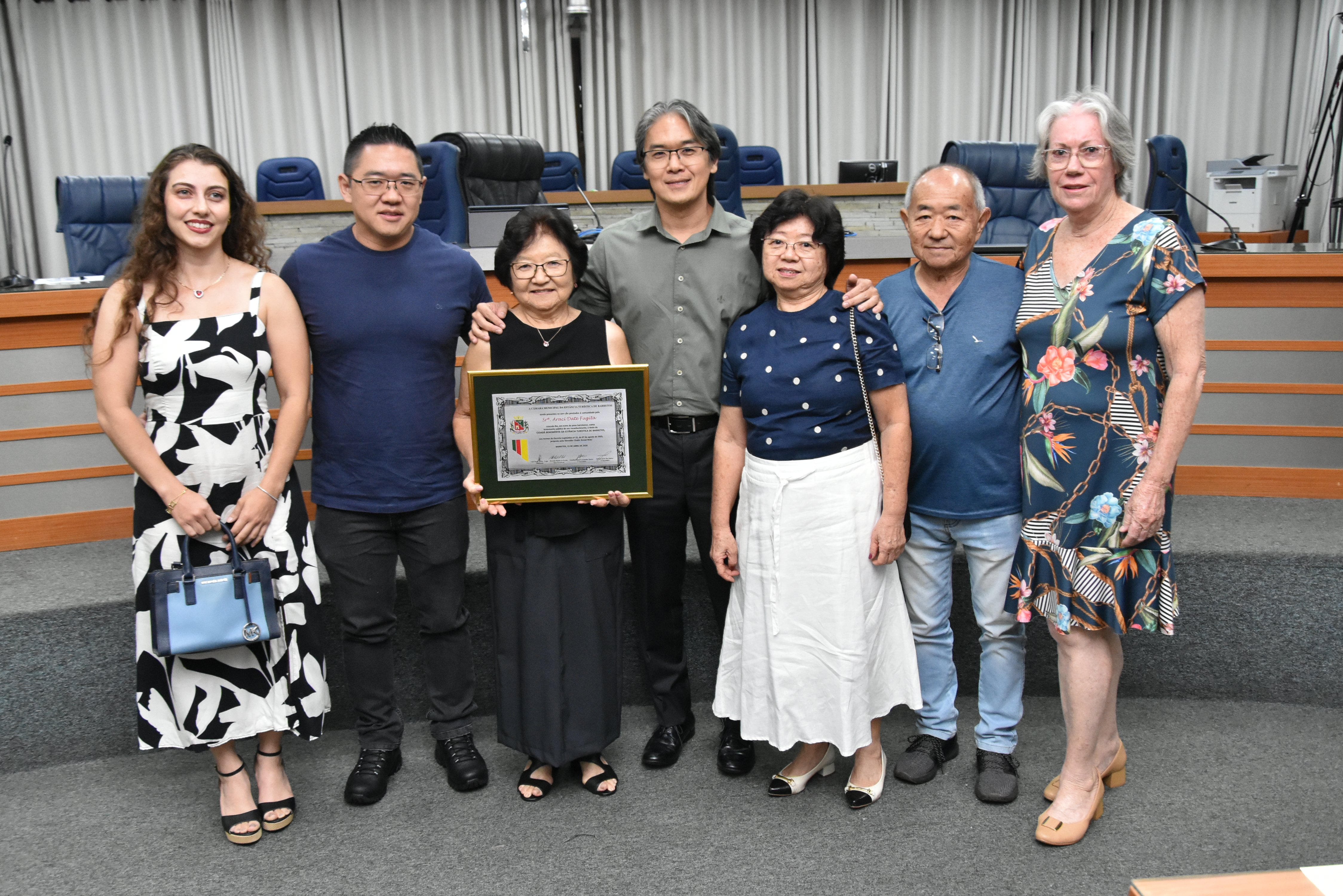 Na noite desta quarta-feira, 15, a Câmara Municipal fez a entrega do Título de Cidadã Benemérita de Barretos à Srª Araci Date Fugita. A homenagem foi concedida durante sessão solene transmitida ao vivo pela TV Câmara.