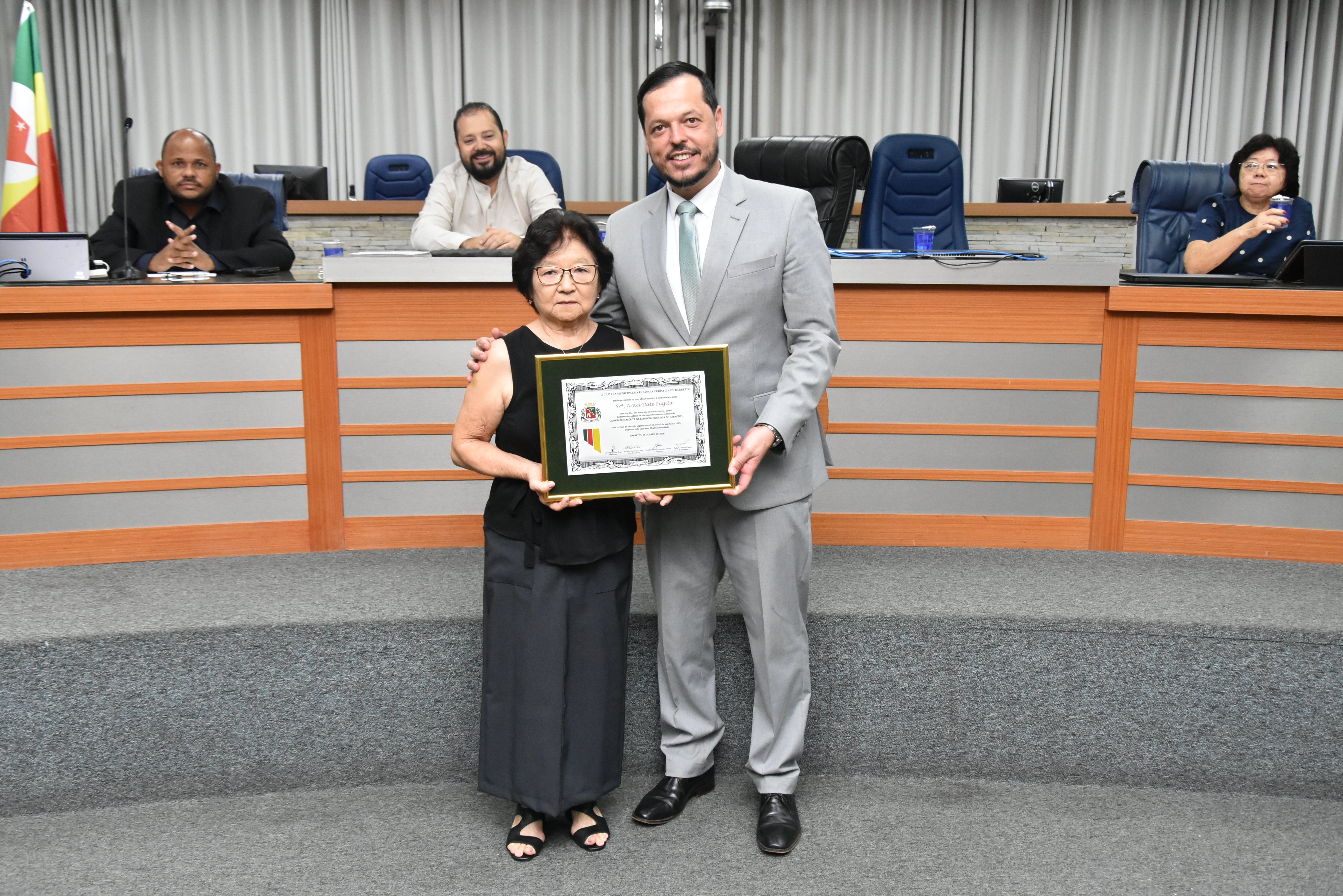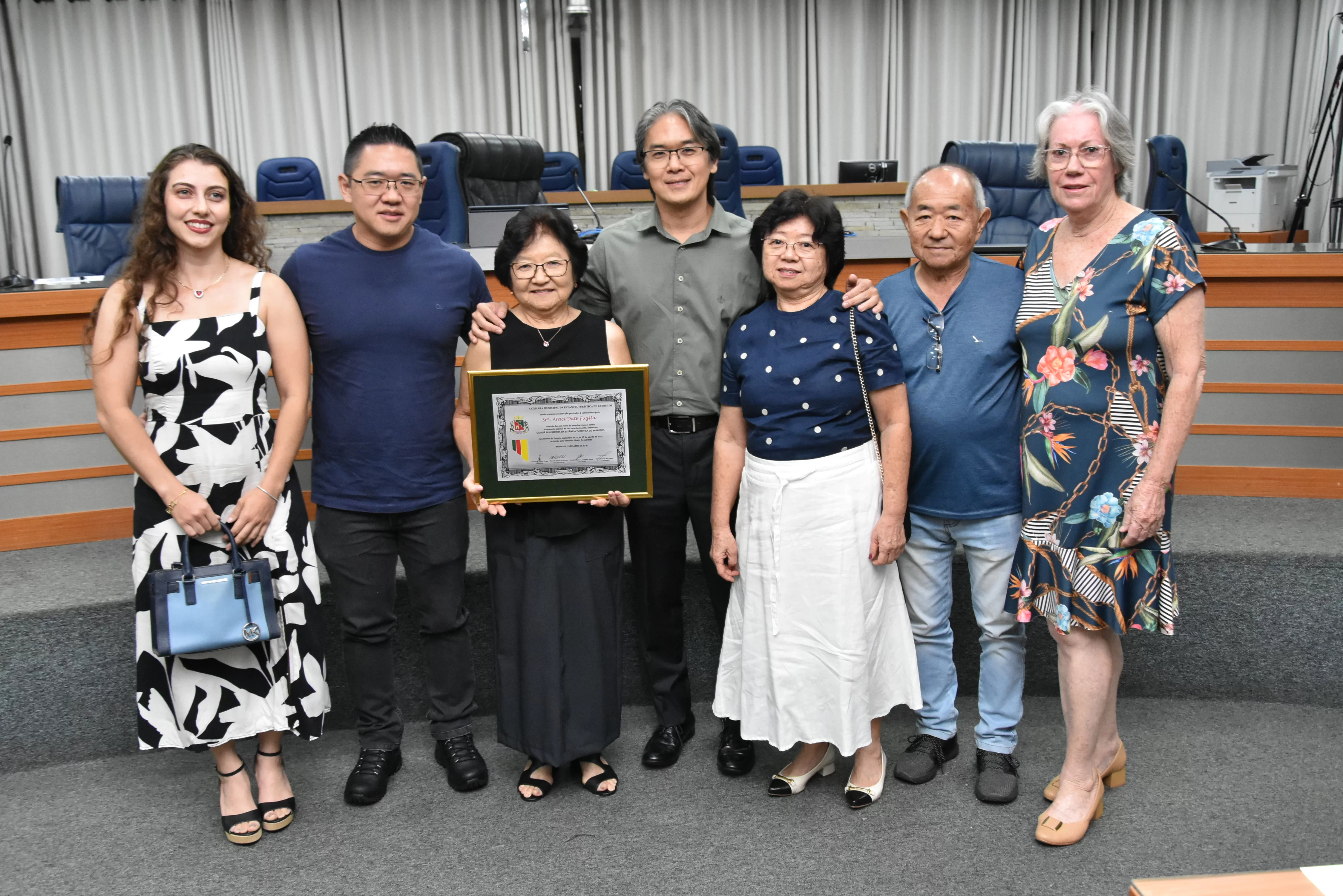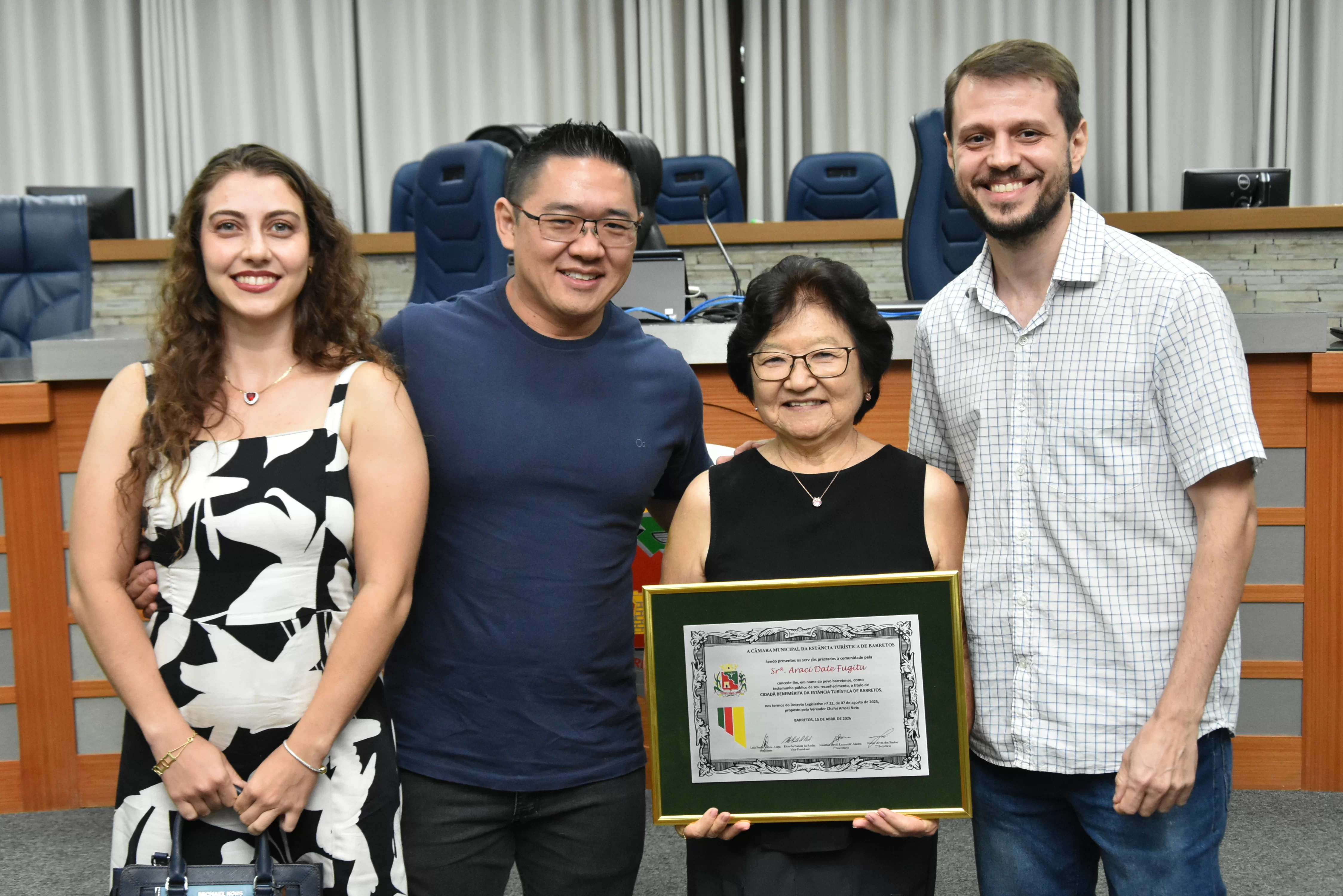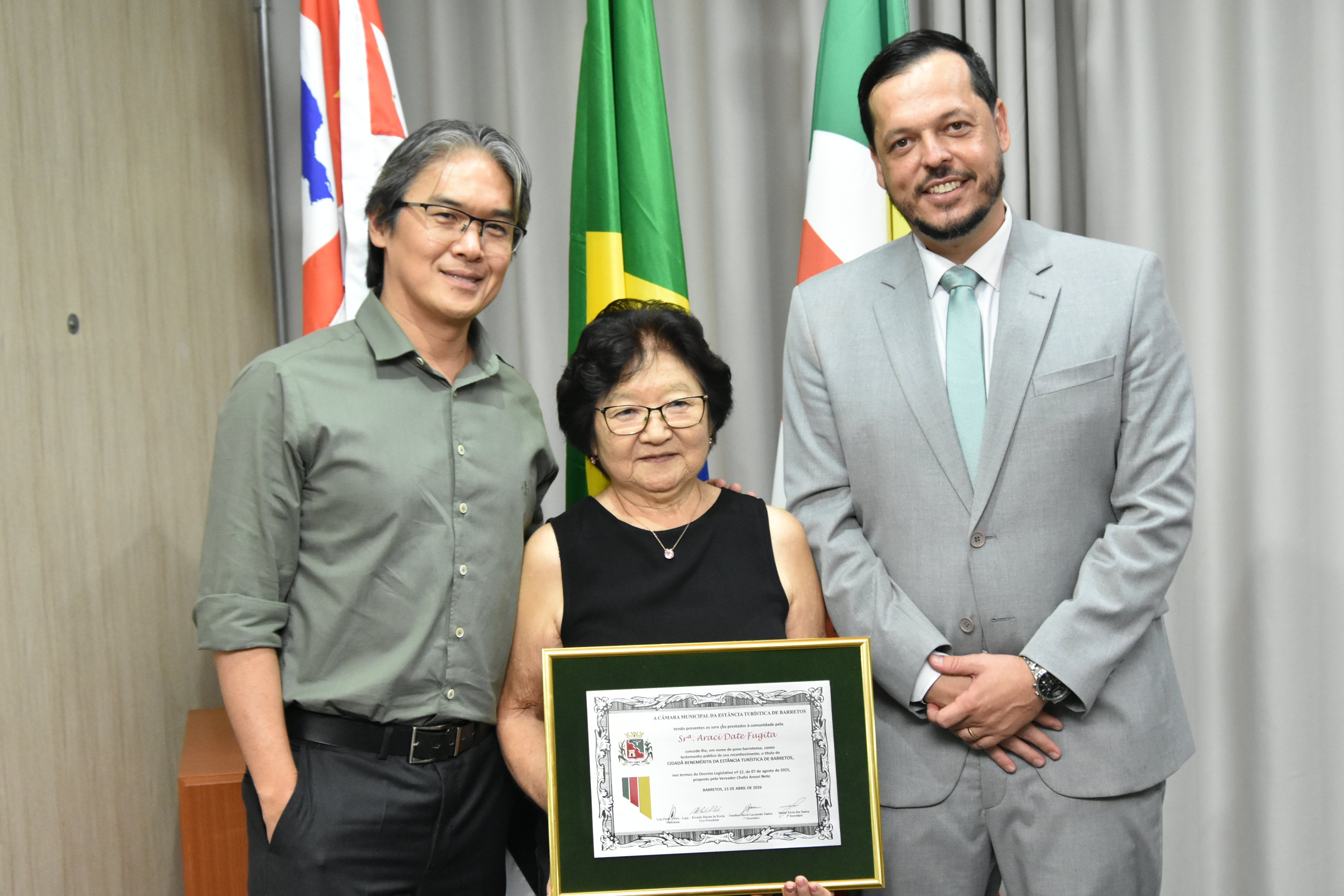 Na noite desta quarta-feira, 15, a Câmara Municipal fez a entrega do Título de Cidadã Benemérita de Barretos à Srª Araci Date Fugita. A homenagem foi concedida durante sessão solene transmitida ao vivo pela TV Câmara.