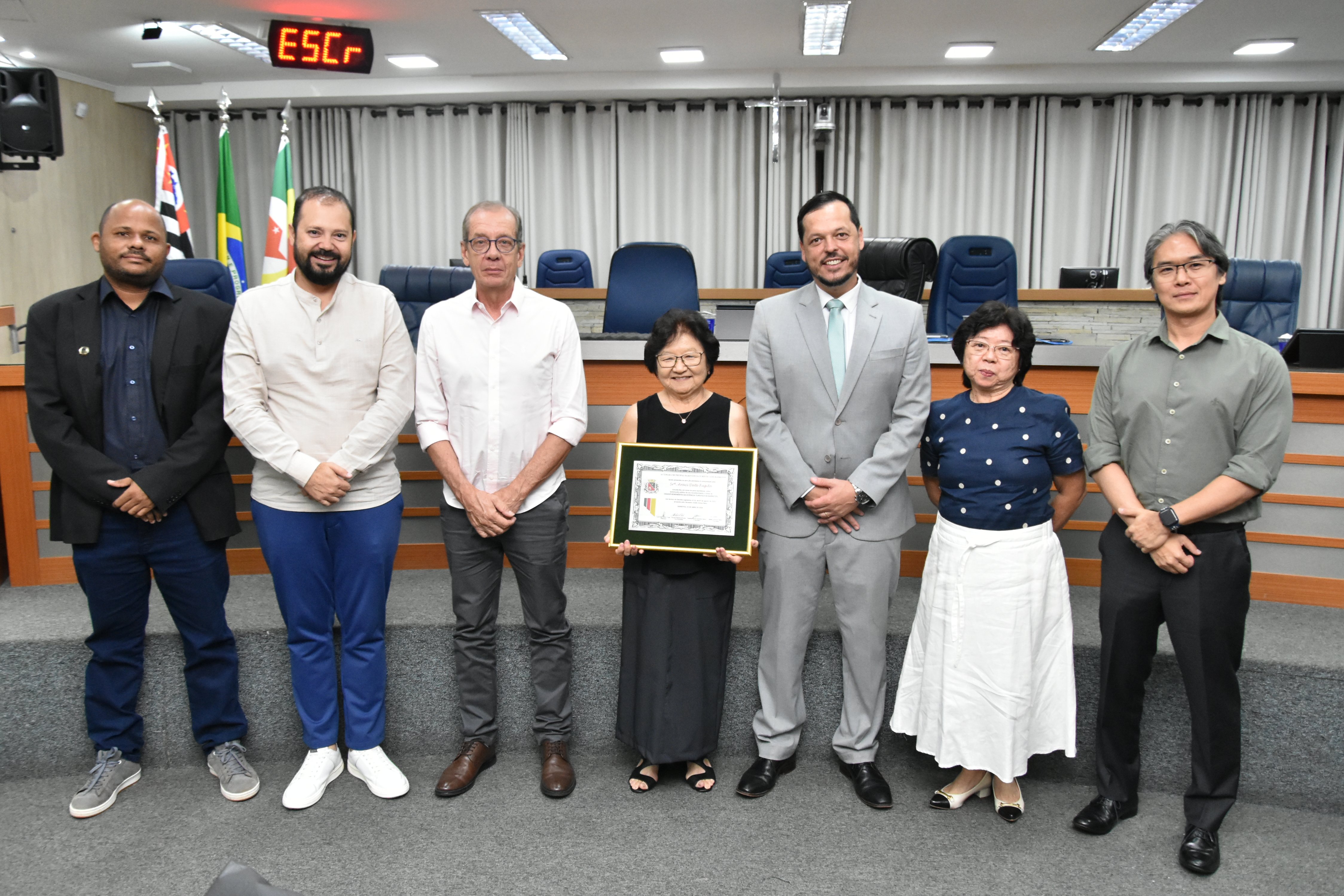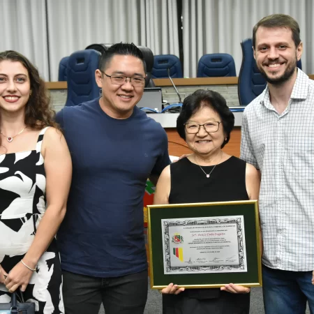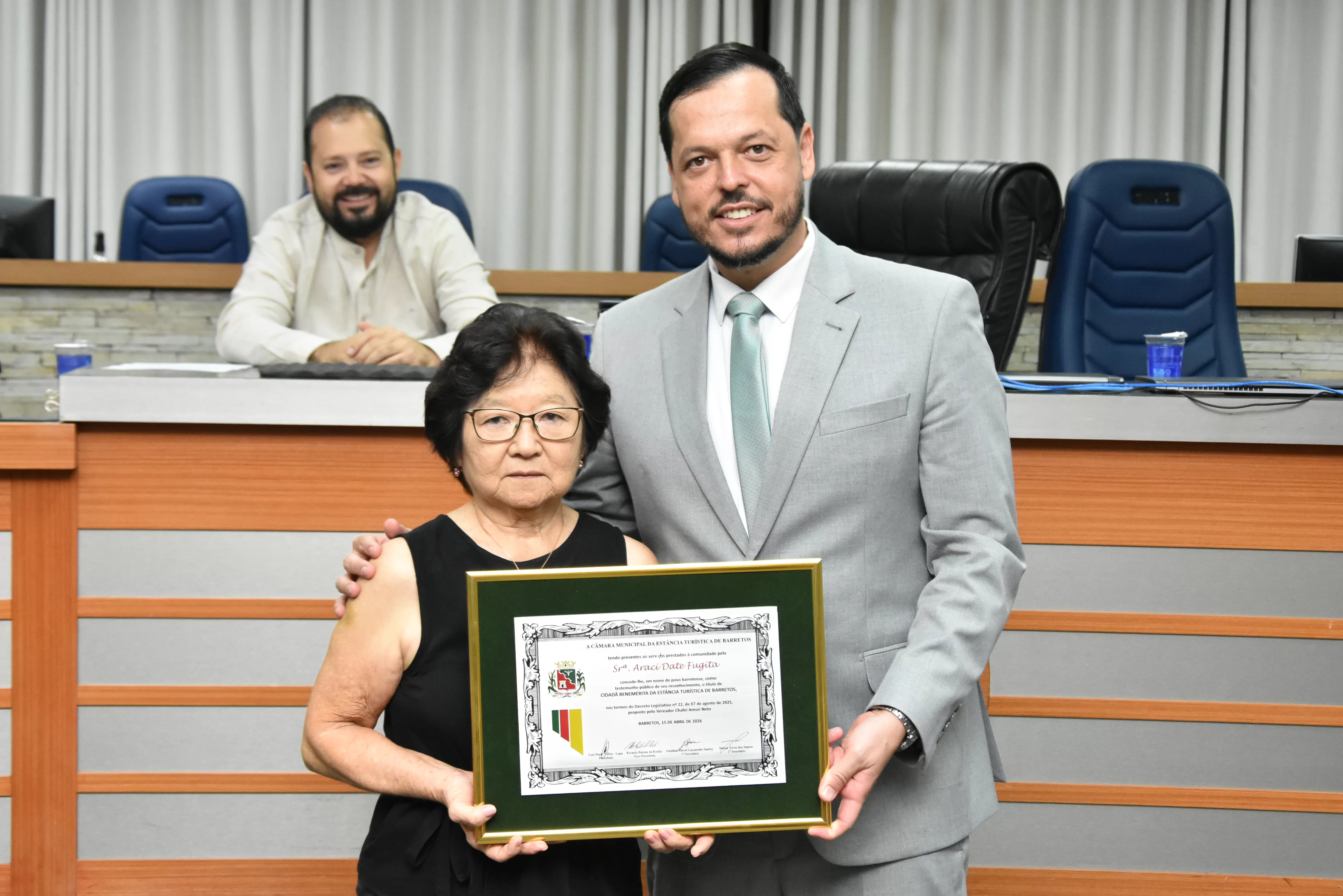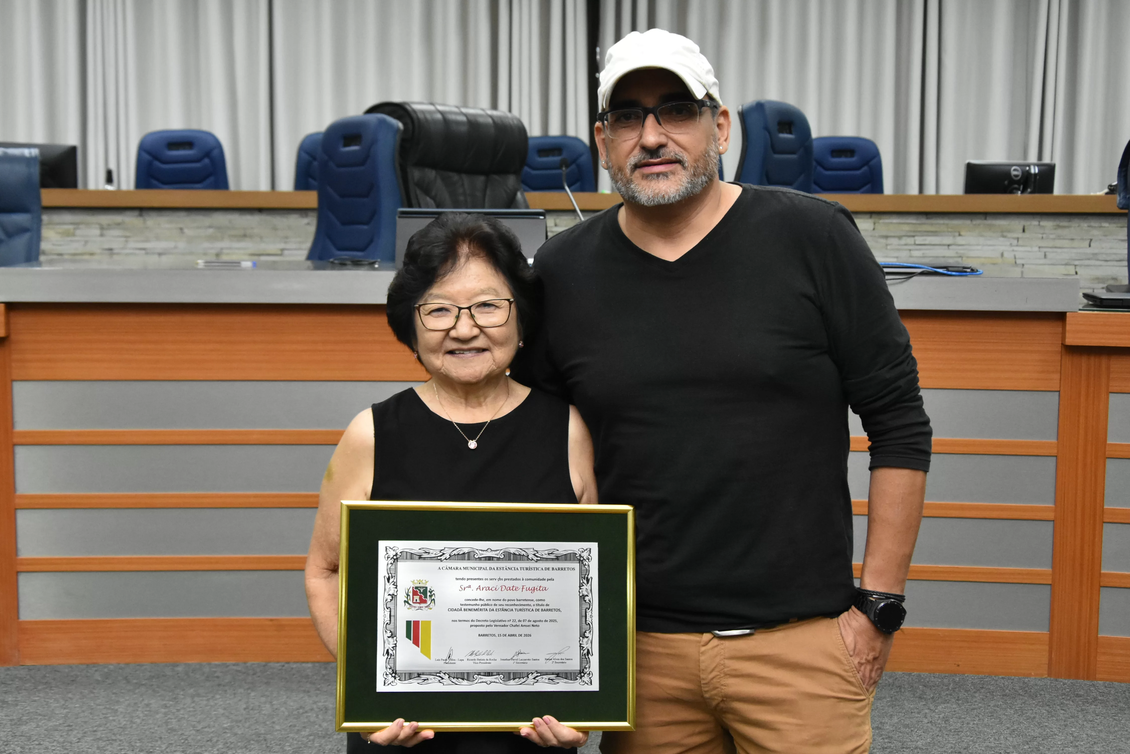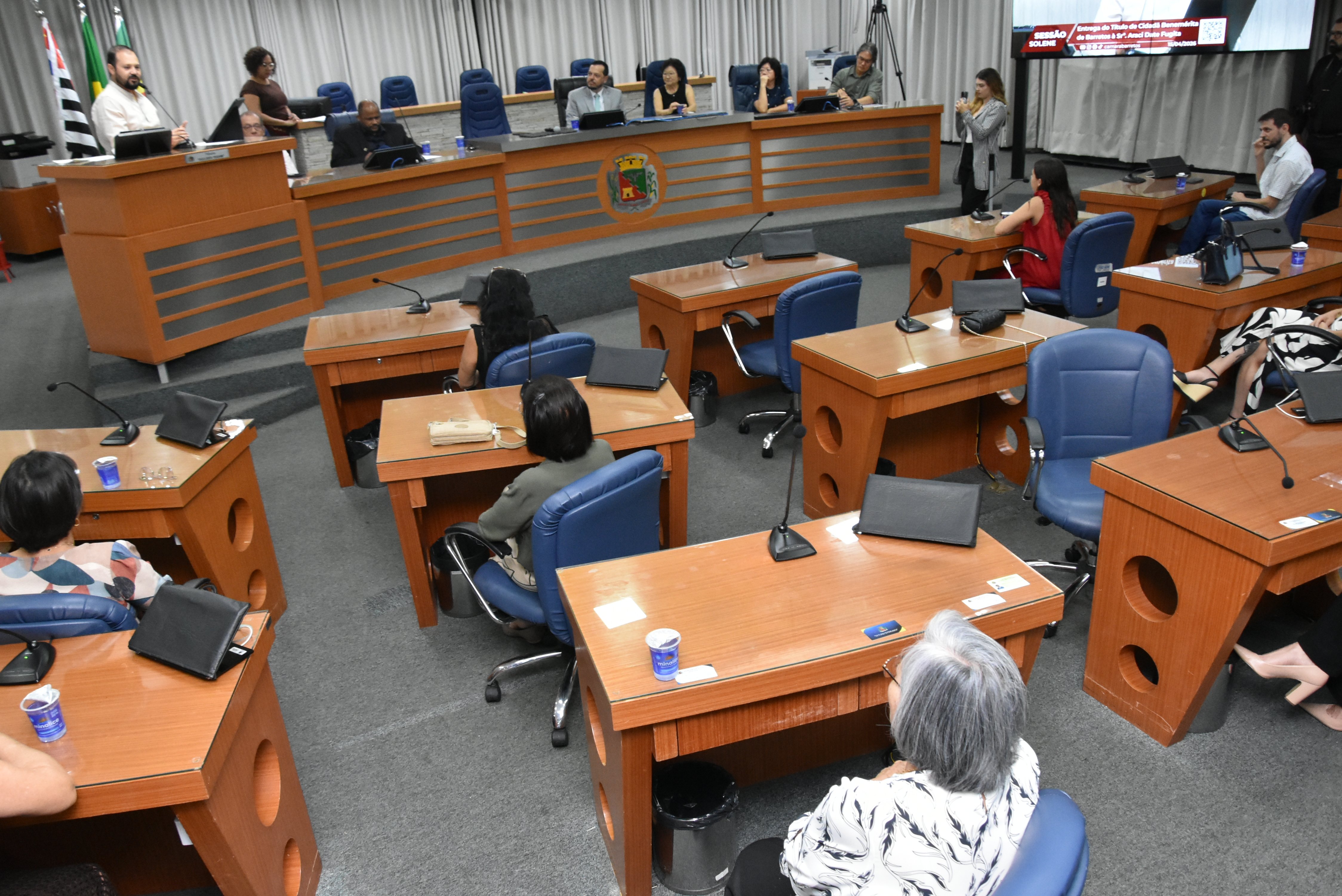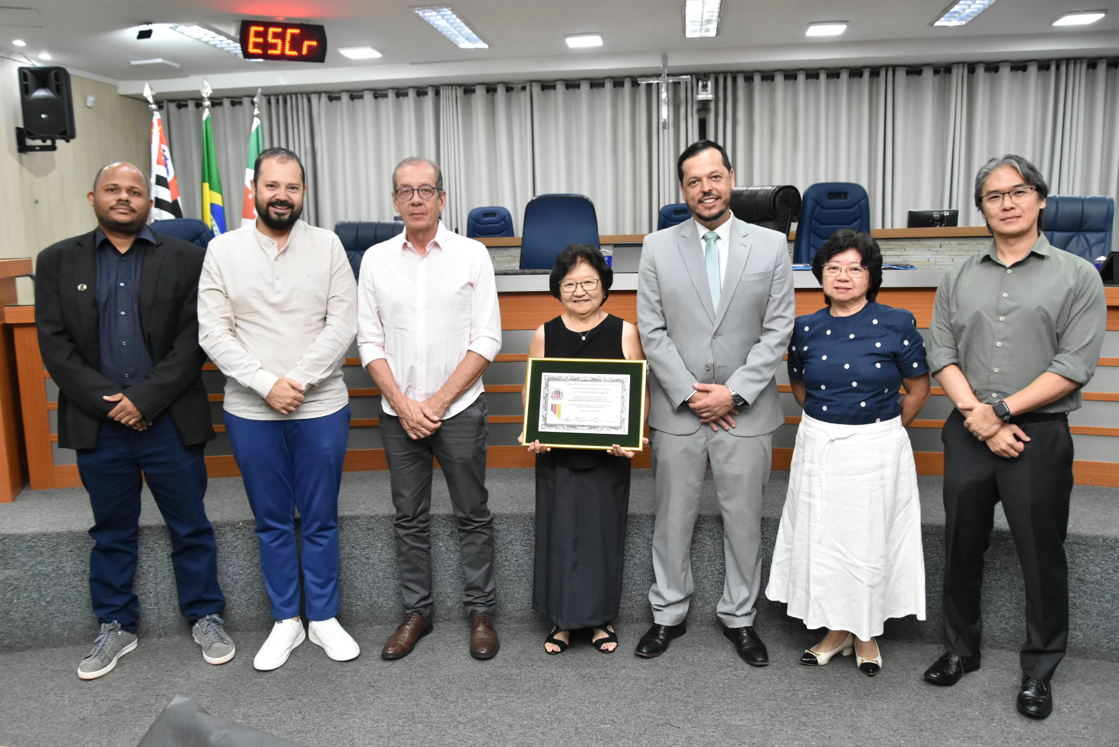 Na noite desta quarta-feira, 15, a Câmara Municipal fez a entrega do Título de Cidadã Benemérita de Barretos à Srª Araci Date Fugita. A homenagem foi concedida durante sessão solene transmitida ao vivo pela TV Câmara.