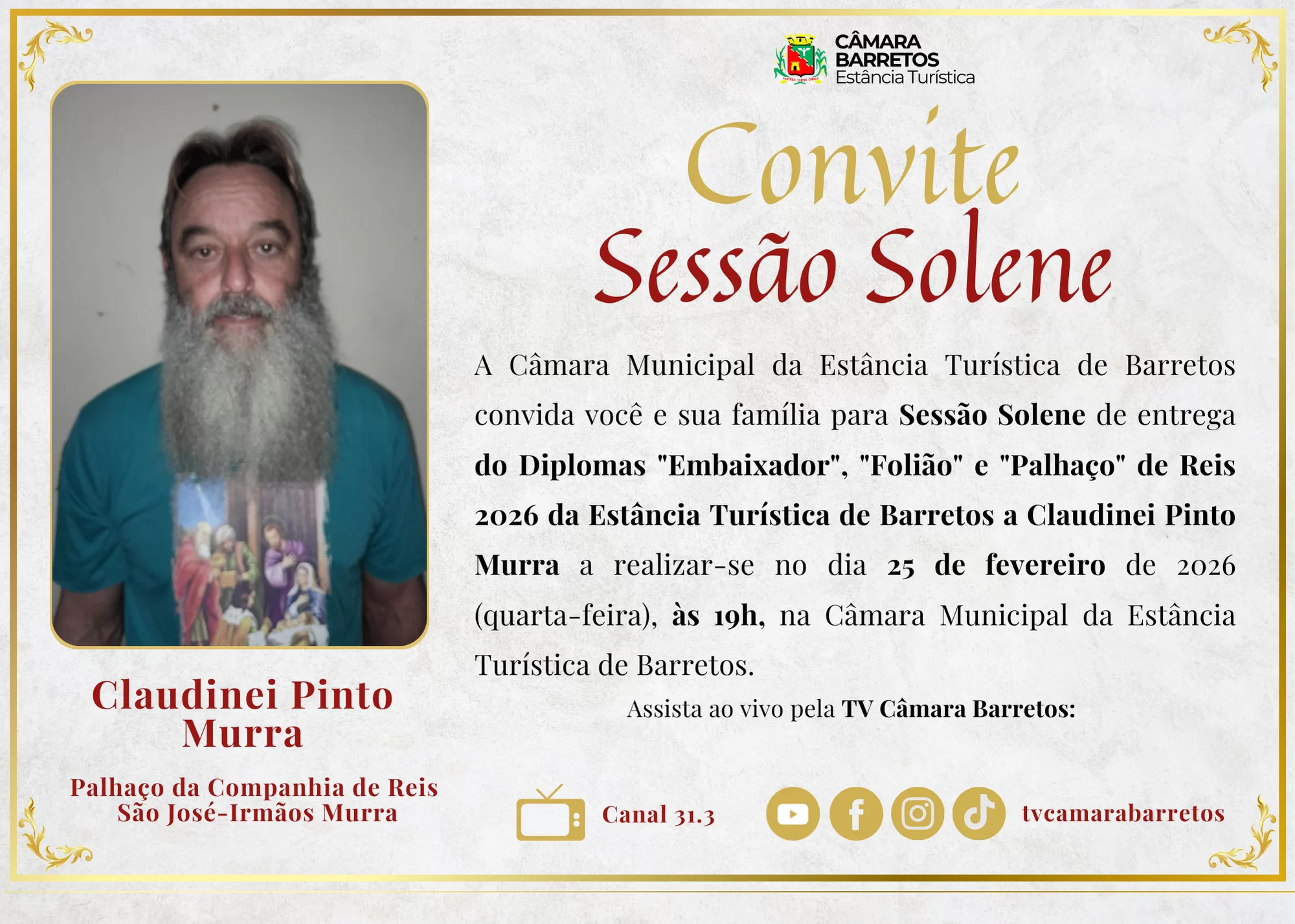 A Câmara de Barretos realizará no dia 25 de fevereiro (quarta-feira), às 19h, Sessão Solene para a entrega dos Diplomas "Embaixador", "Folião" e "Palhaço" de Reis 2026.