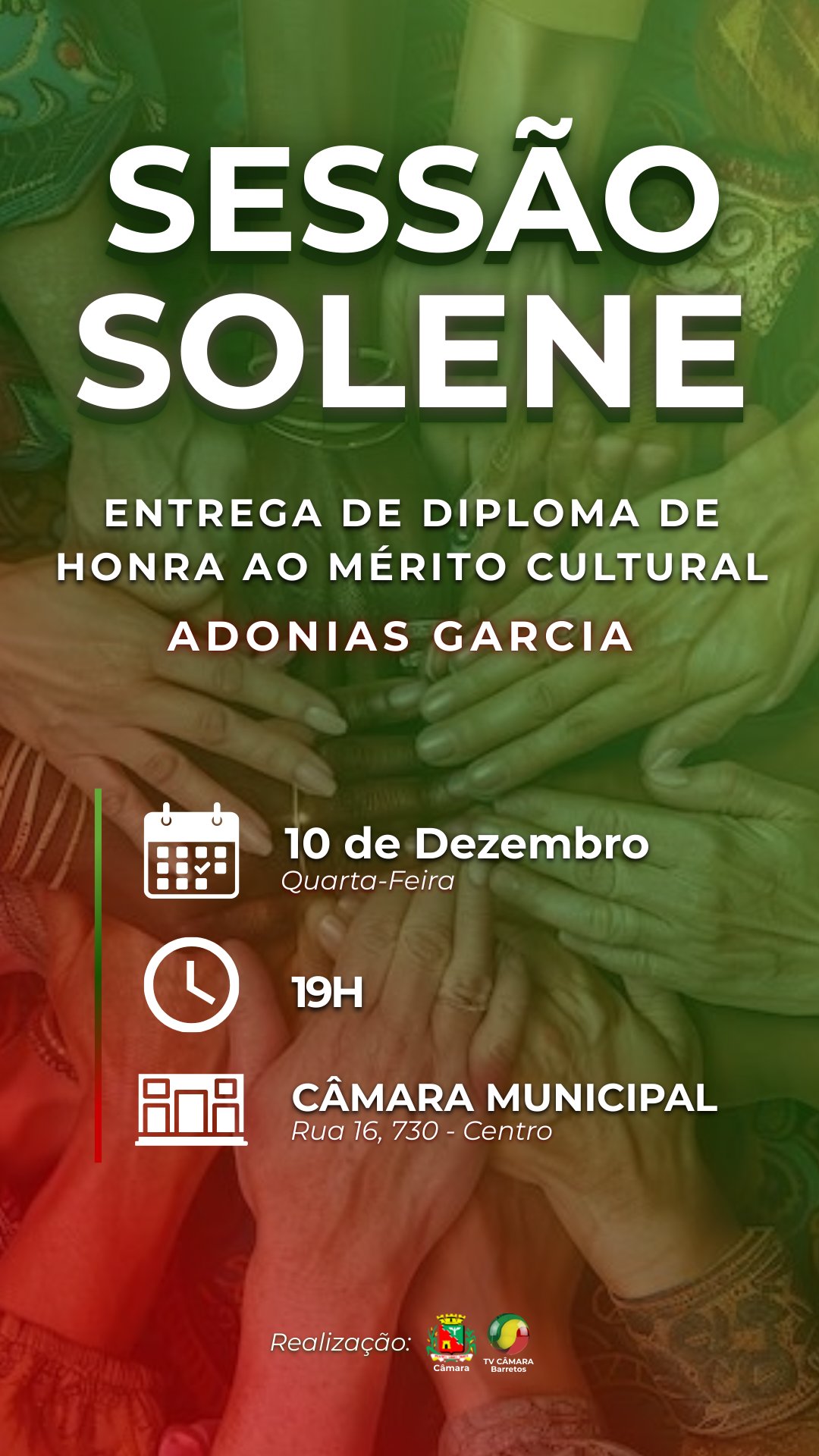 A Câmara Municipal de Barretos realizará na noite de quarta-feira (10/dezembro), às 19h, Sessão Solene de entrega do Diploma de Honra ao Mérito Cultural “ADONIAS GARCIA” 2025, que homenageará várias personalidades da cultura barretense.