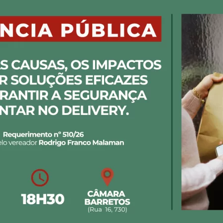 Com o crescimento expressivo dos pedidos por aplicativos e entregas domiciliares nos últimos anos, surgem também novos desafios relacionados ao armazenamento, transporte e higiene dos alimentos. A audiência pretende abrir espaço para ouvir a comunidade, identificar problemas recorrentes e propor soluções que garantam mais segurança e confiança para os consumidores.