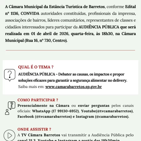 Acontecerá no próximo dia 1º de abril, quarta-feira, às 18H30, no Plenário da Câmara, Audiência Pública para discutir a segurança alimentar no delivery em Barretos.