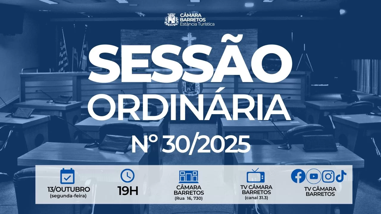 A Câmara de Barretos realizou na segunda-feira (13/outubro), às 19h, a 30ª Sessão Ordinária de 2025. Ao todo foram discutidas e votadas 16 matérias: 1 Redação Final, 8 Projetos de Lei, 1 Projeto de Lei Complementar e 6 Projetos de Decreto Legislativo.