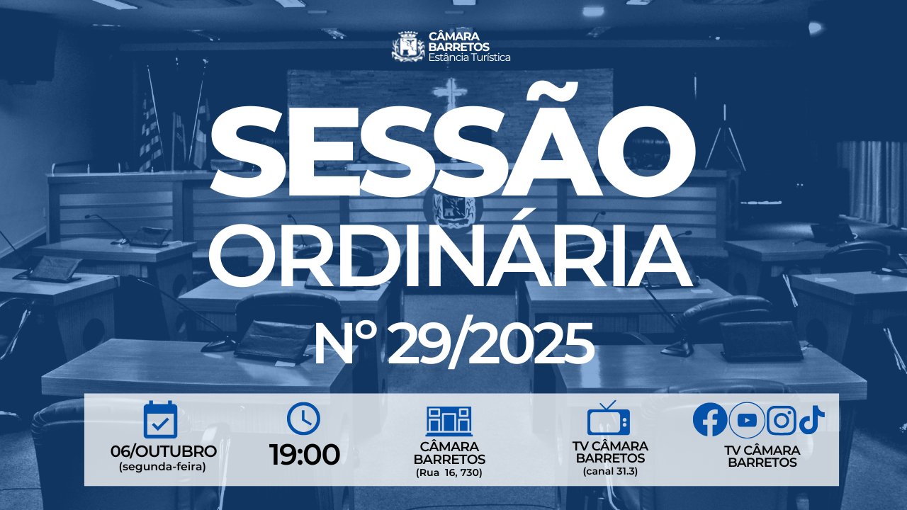 A Câmara de Barretos realizou na segunda-feira (06/outubro), às 19h, a 29ª Sessão Ordinária de 2025. Ao todo 13 matérias: 1 Parecer da Comissão de Justiça e Redação pela inconstitucionalidade, 2 Redações Finais, 1 Projeto de Lei Complementar, 8 Projetos de Lei e 1 Projeto de Decreto Legislativo.