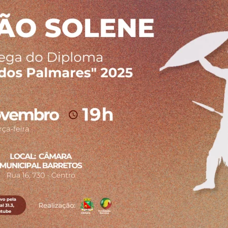 A Câmara Municipal realizará no dia 18/novembro (terça-feira), às 19h, Sessão Solene para a entrega do Prêmio "Zumbi dos Palmares" 2025, dedicado a personalidades que atuam na luta contra a discriminação racial e demais intolerâncias contra minorias.