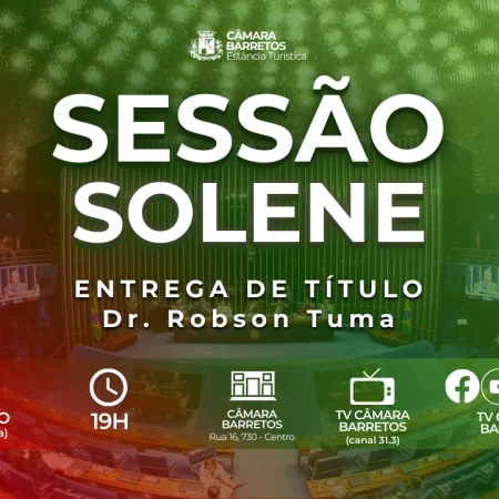 A Câmara Municipal de Barretos realizará no dia 12 de março (quinta-feira), às 19h, Sessão Solene para entrega do Título de Cidadão Honorário da Estância Turística de Barretos ao Dr. Robson Tuma, Presidente do Partido Republicanos da capital de São Paulo.