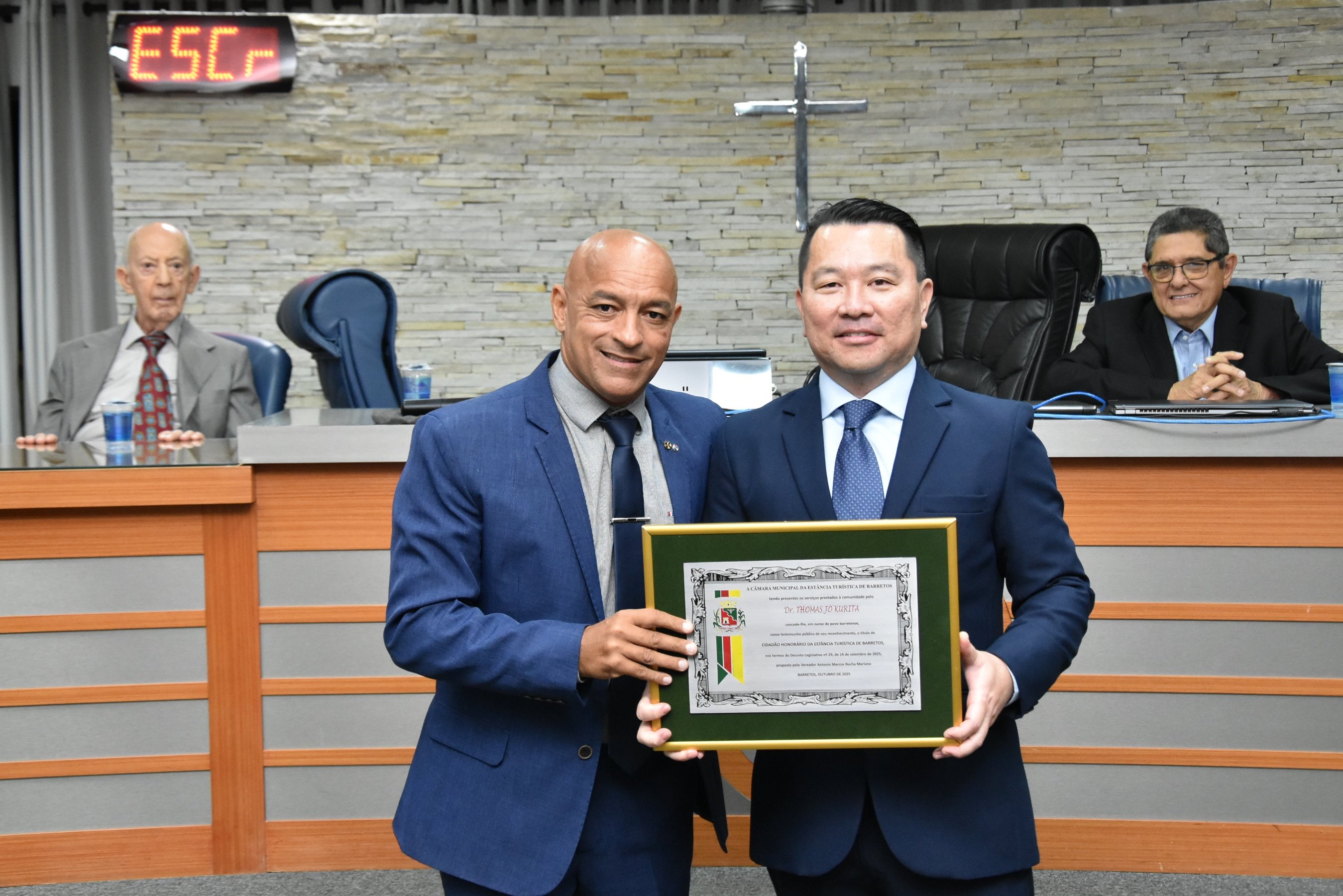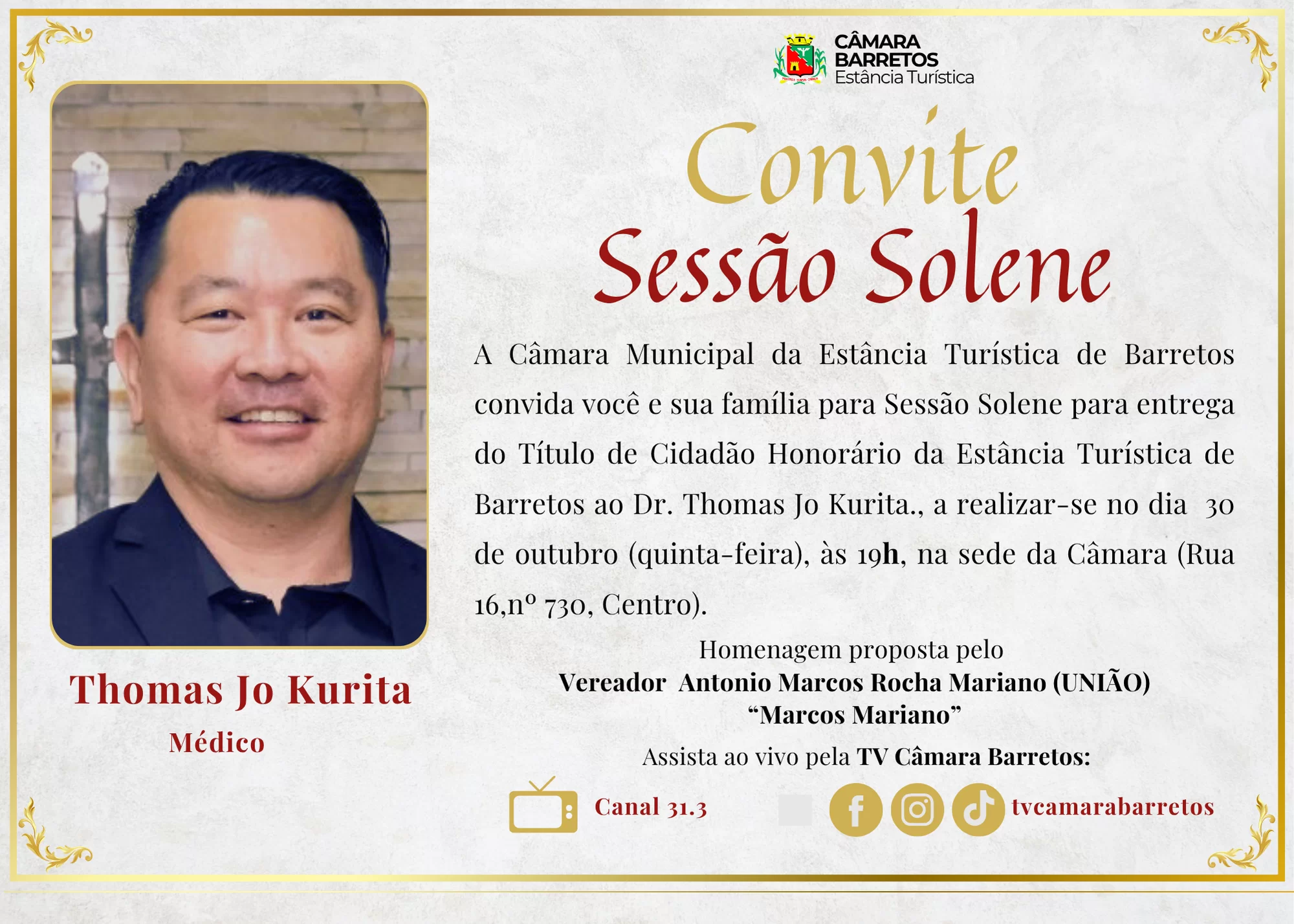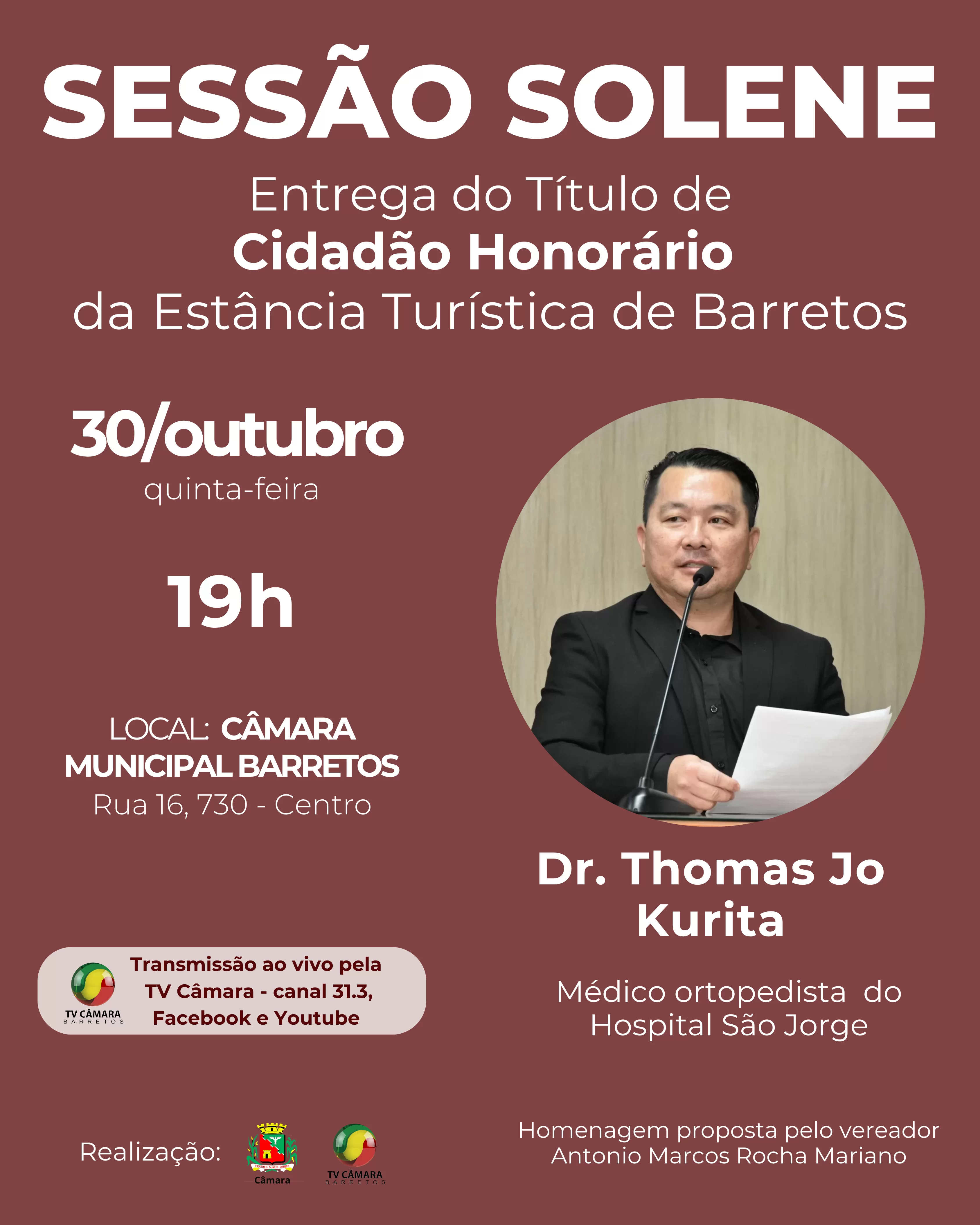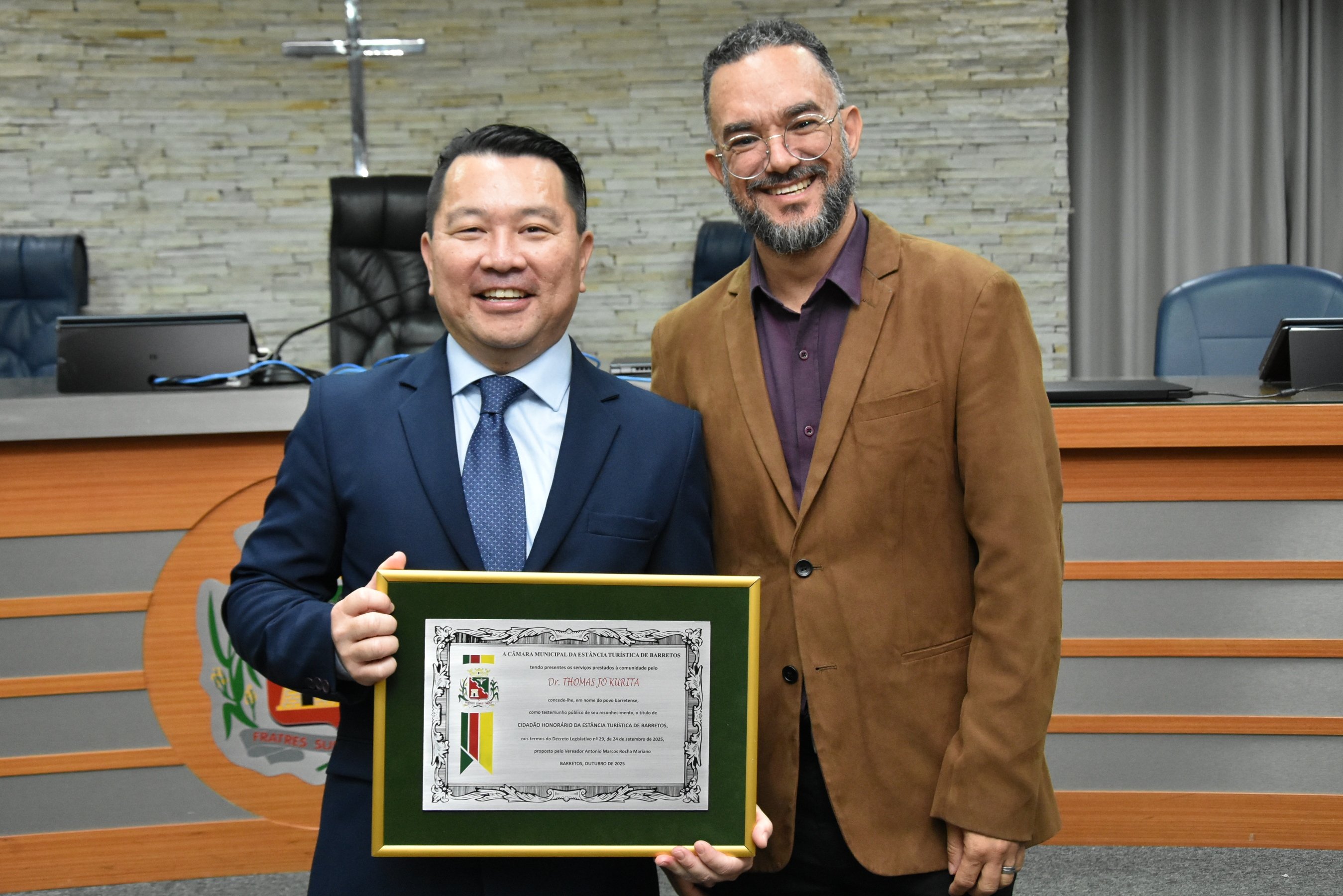 A Câmara Municipal de Barretos realizou no dia 30 de outubro (quinta-feira), às 19h, Sessão Solene para entrega do Título de Cidadão Honorário da Estância Turística de Barretos ao Dr. Thomas Jo Kurita.