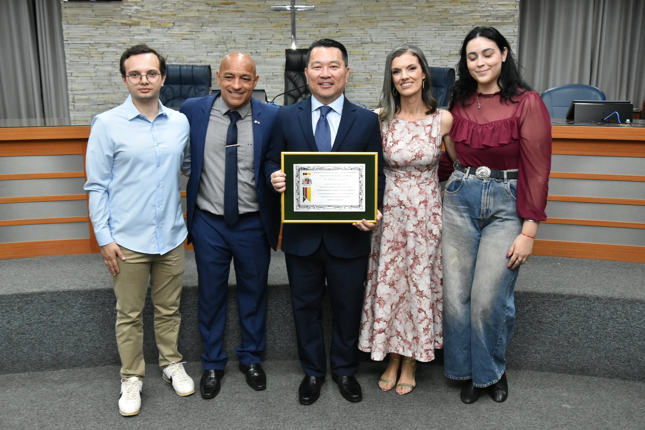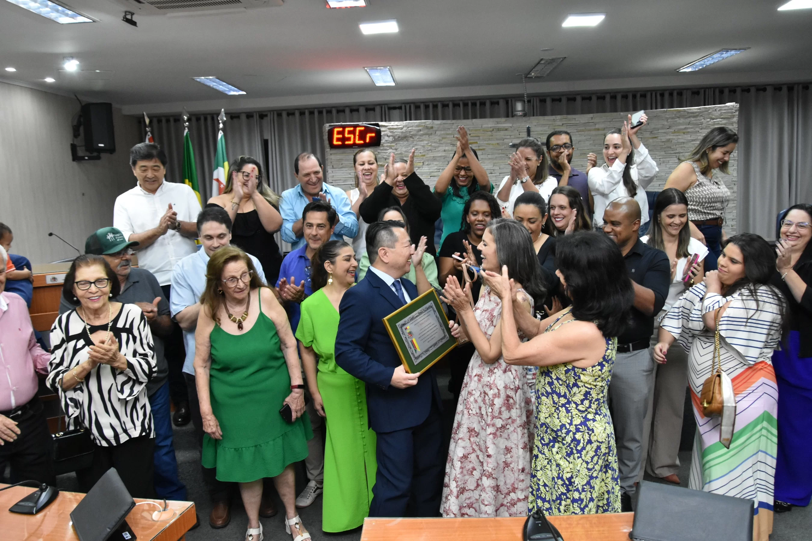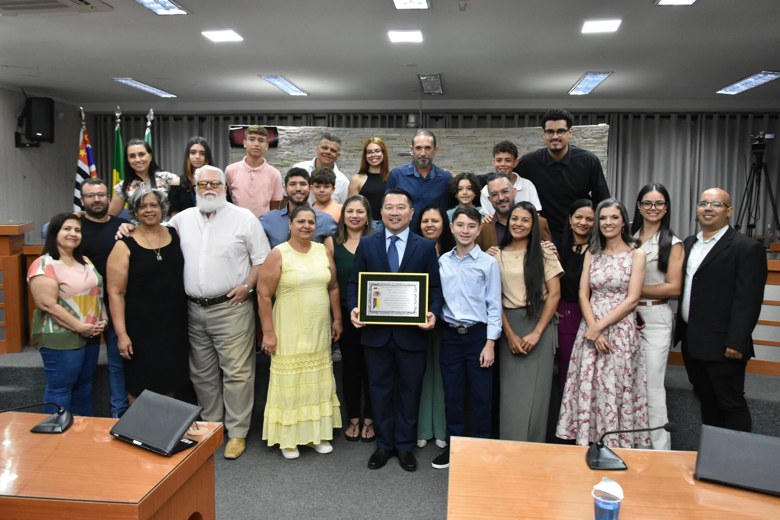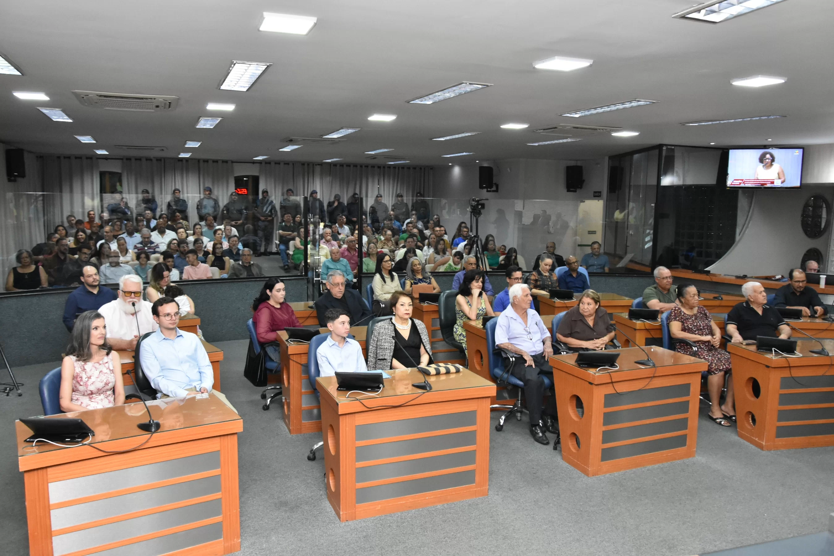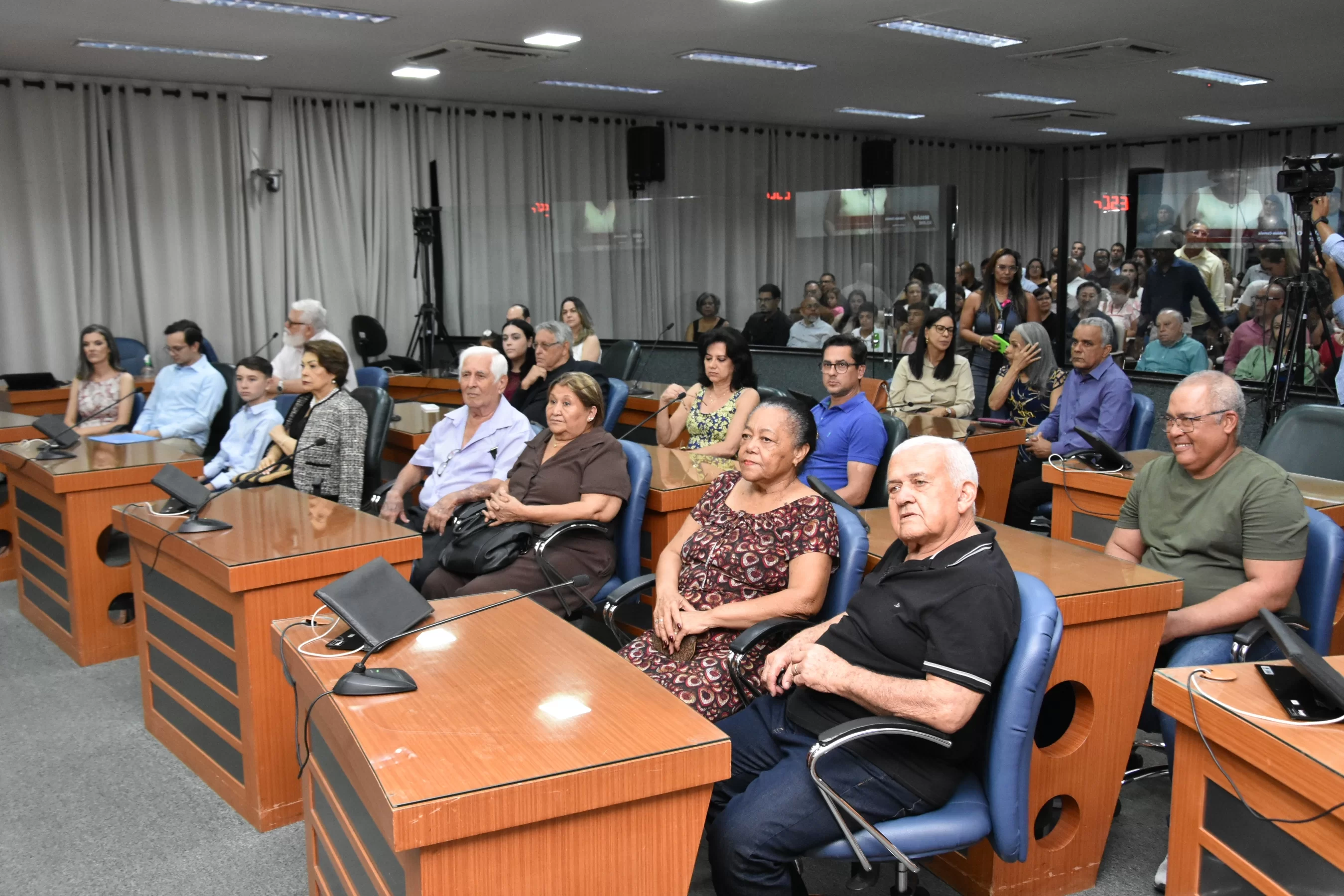 Várias autoridades, familiares e amigos do homenageado estiveram presentes e lotaram o Plenário da Câmara Municipal para prestigiarem a solenidade.