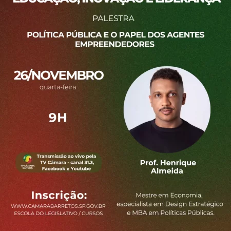 A Escola do Legislativo de Barretos realizou na manhã do dia 26 de novembro, palestra “Política Pública e o papel dos agentes empreendedores”, em parceria com o SEBRAE-SP e contou com a participação de Marco Vinholi, Diretor Técnico do Sebrae-SP e Henrique Almeida, professor da Faculdade Sebrae.