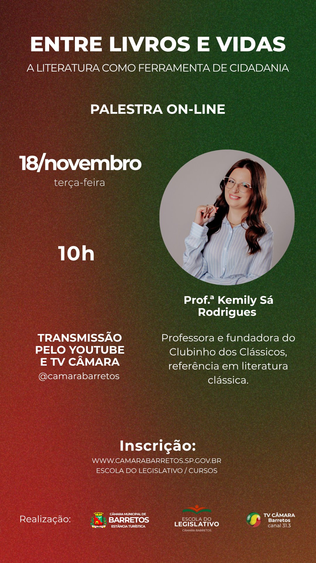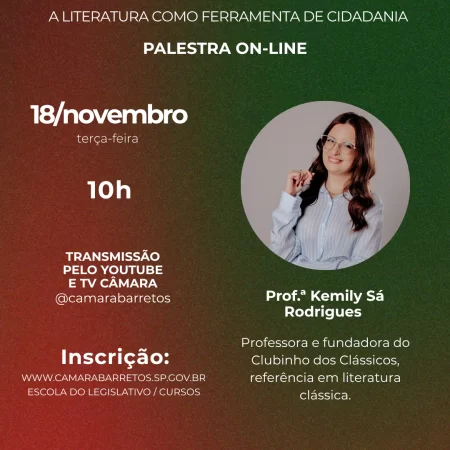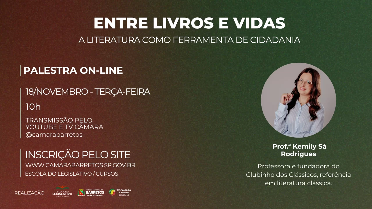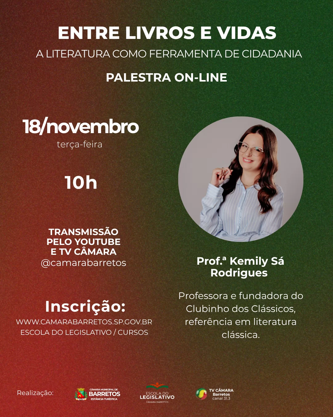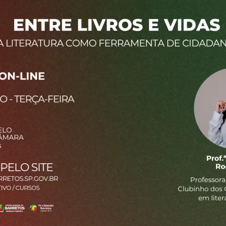 A Escola do Legislativo de Barretos realizará, na terça-feira, 18 de novembro, às 10h, a palestra “Entre Livros e Vidas: A Literatura como Ferramenta de Cidadania”, com transmissão ao vivo pela TV Câmara (canal 31.3), YouTube e plataforma Zoom.
