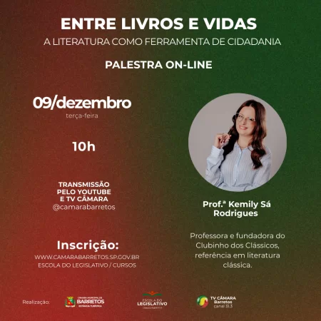 A Escola do Legislativo de Barretos realizará, na terça-feira, 09 de dezembro, às 10h, a palestra “Entre Livros e Vidas: A Literatura como Ferramenta de Cidadania”, ON LINE, com transmissão ao vivo pela TV Câmara (canal 31.3), YouTube e plataforma Zoom.