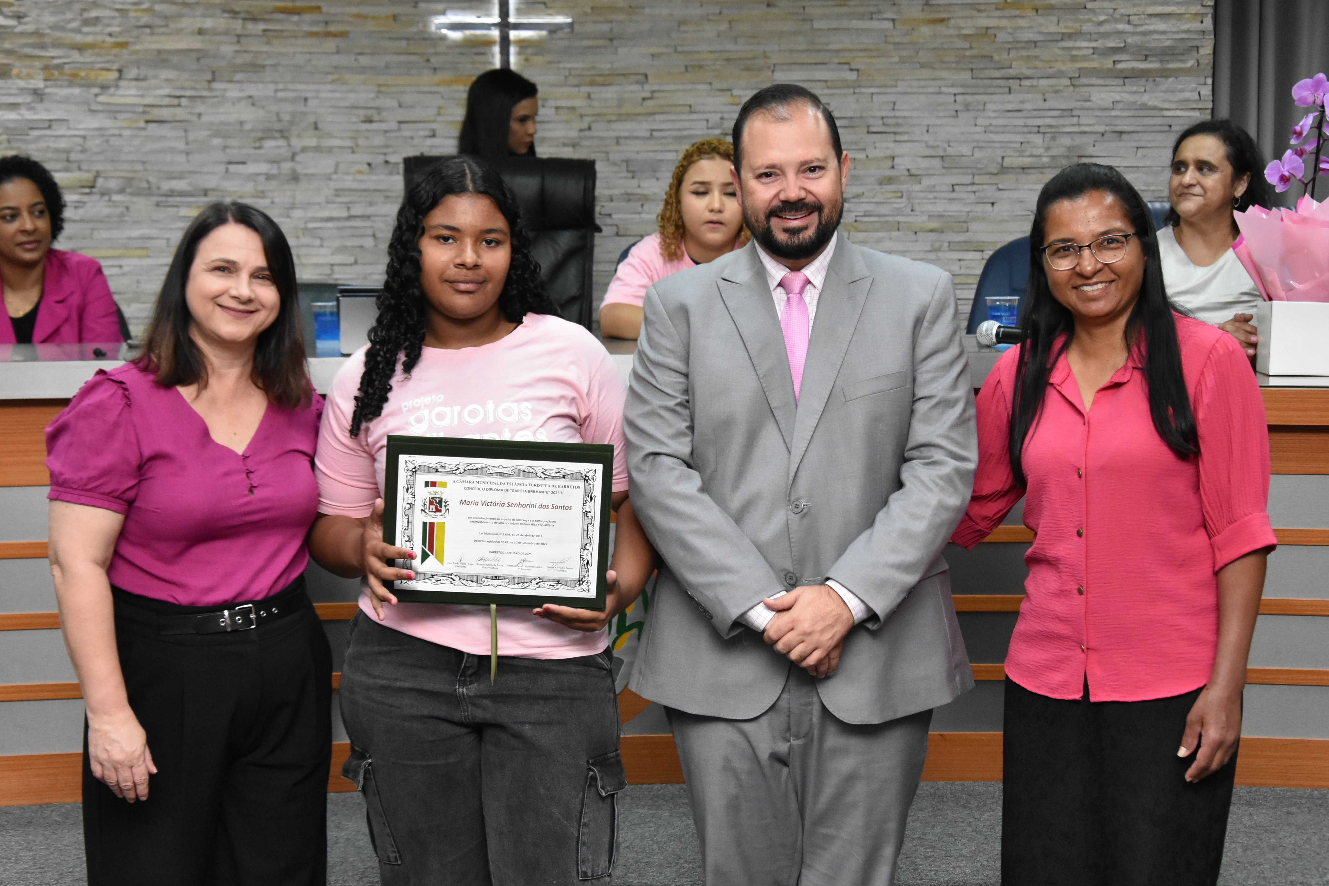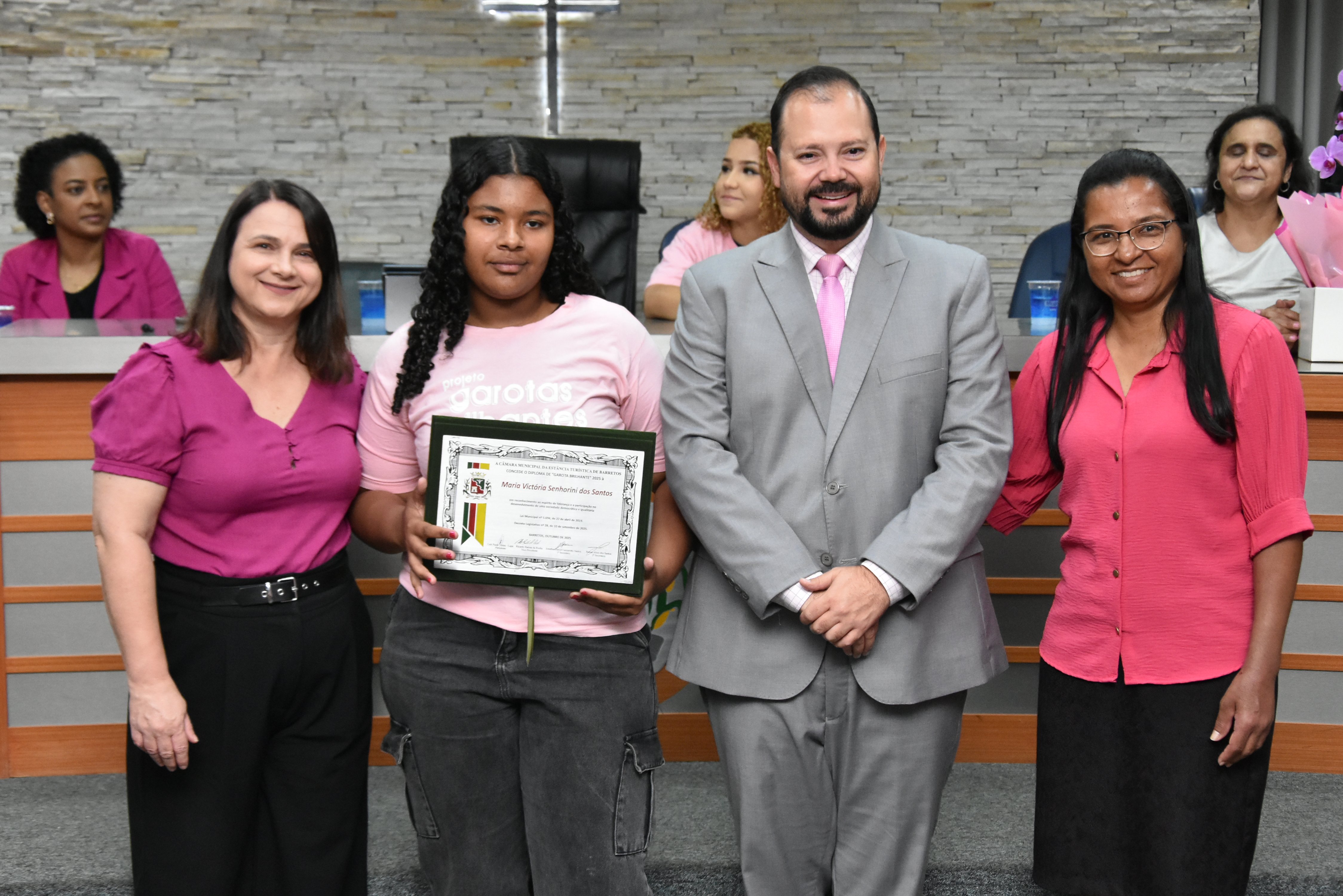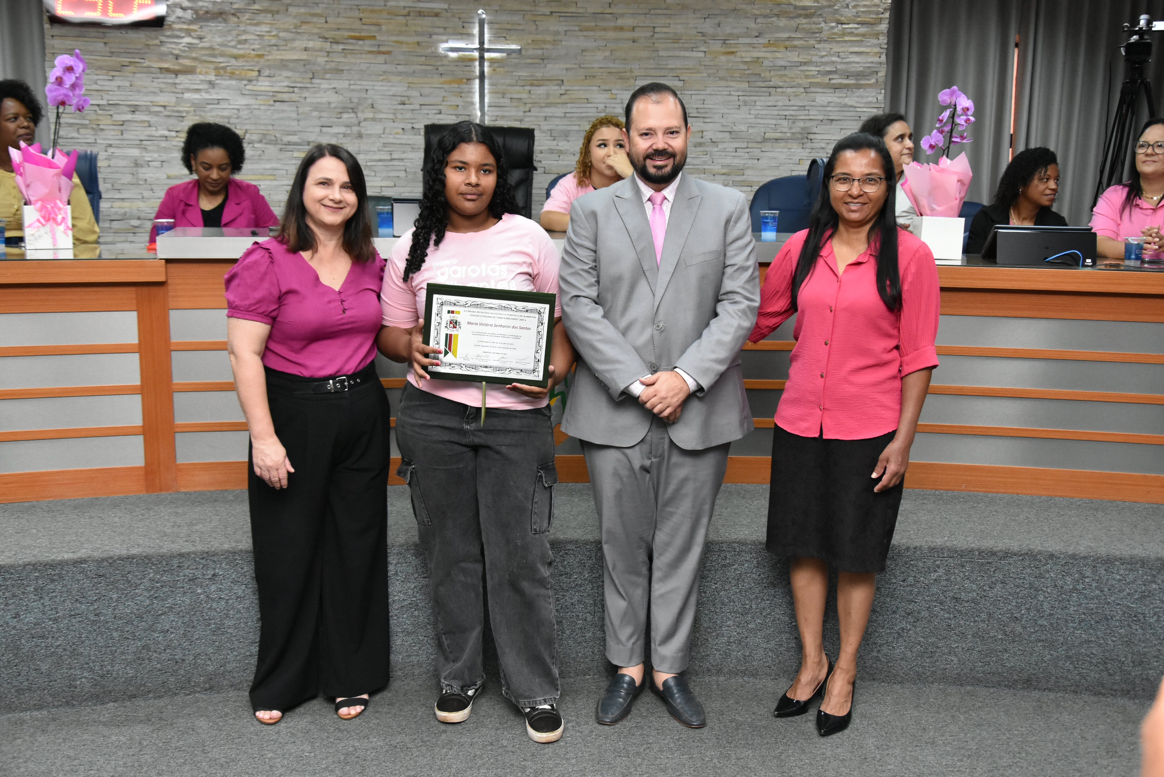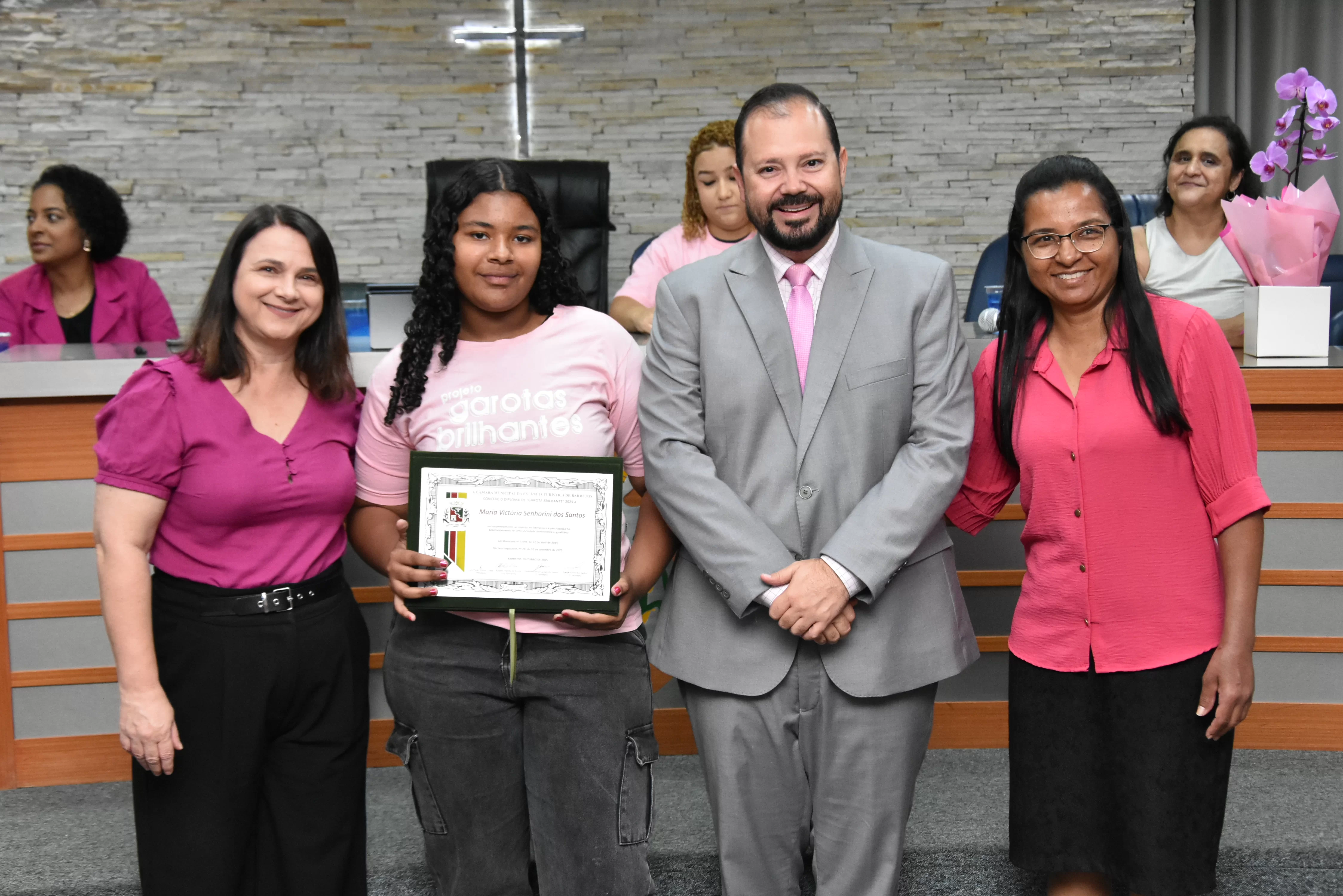 A solenidade foi conduzida pelo 2º Secretario da Câmara, Vereador Itamar Alves dos Santos (PSD) e contou ainda com presença do vereador Marcos Mariano (UNIÃO); da Coordenadora do CAAF -Centro Adventista de Apoio à Família de Barretos, Adriana Gonçalves Ferreira; da Assistente Social do Projeto Garotas Brilhantes, Pâmela Camargo; da Coordenadora Regional da ADRA - Agência Adventista de Desenvolvimento e Recursos Assistenciais, Estela Maris Miller Reis; da Diretora da Escola Estadual Mario Vieira Marcondes (local onde funciona o projeto Garotas Brilhantes); Marta Regina Rocha, Secretária Municipal de Assistência Social e Desenvolvimento Humano, Juliana Adão.