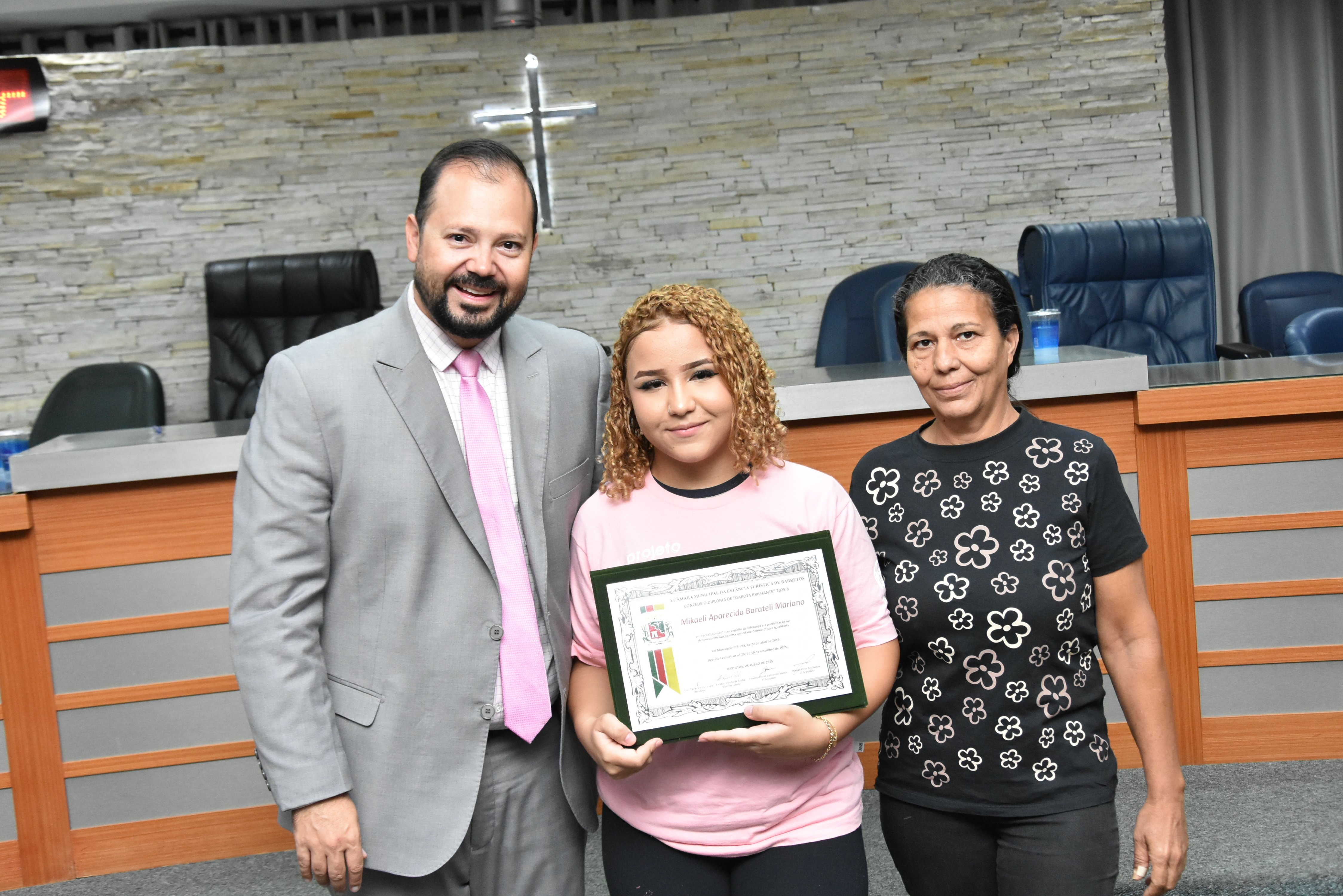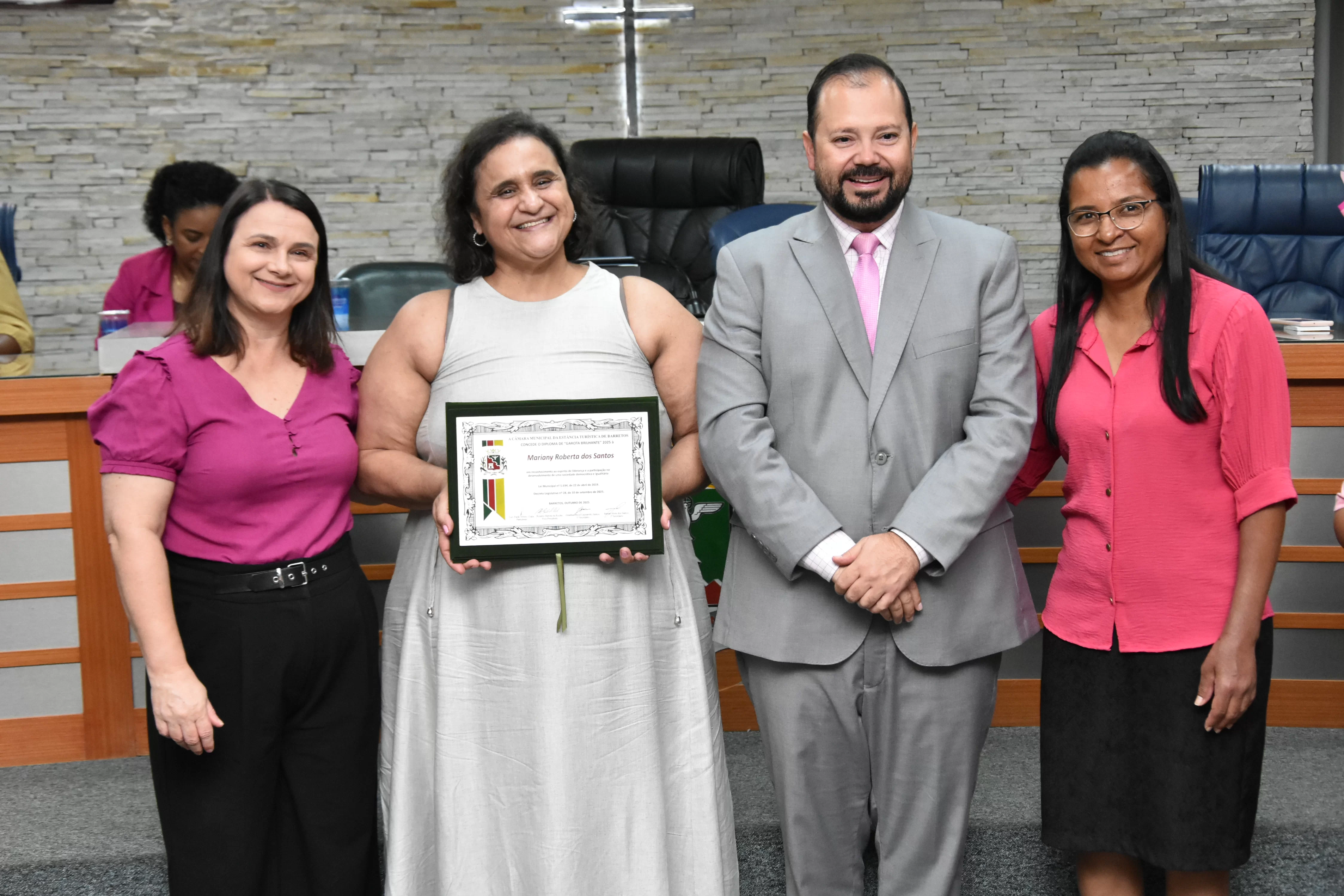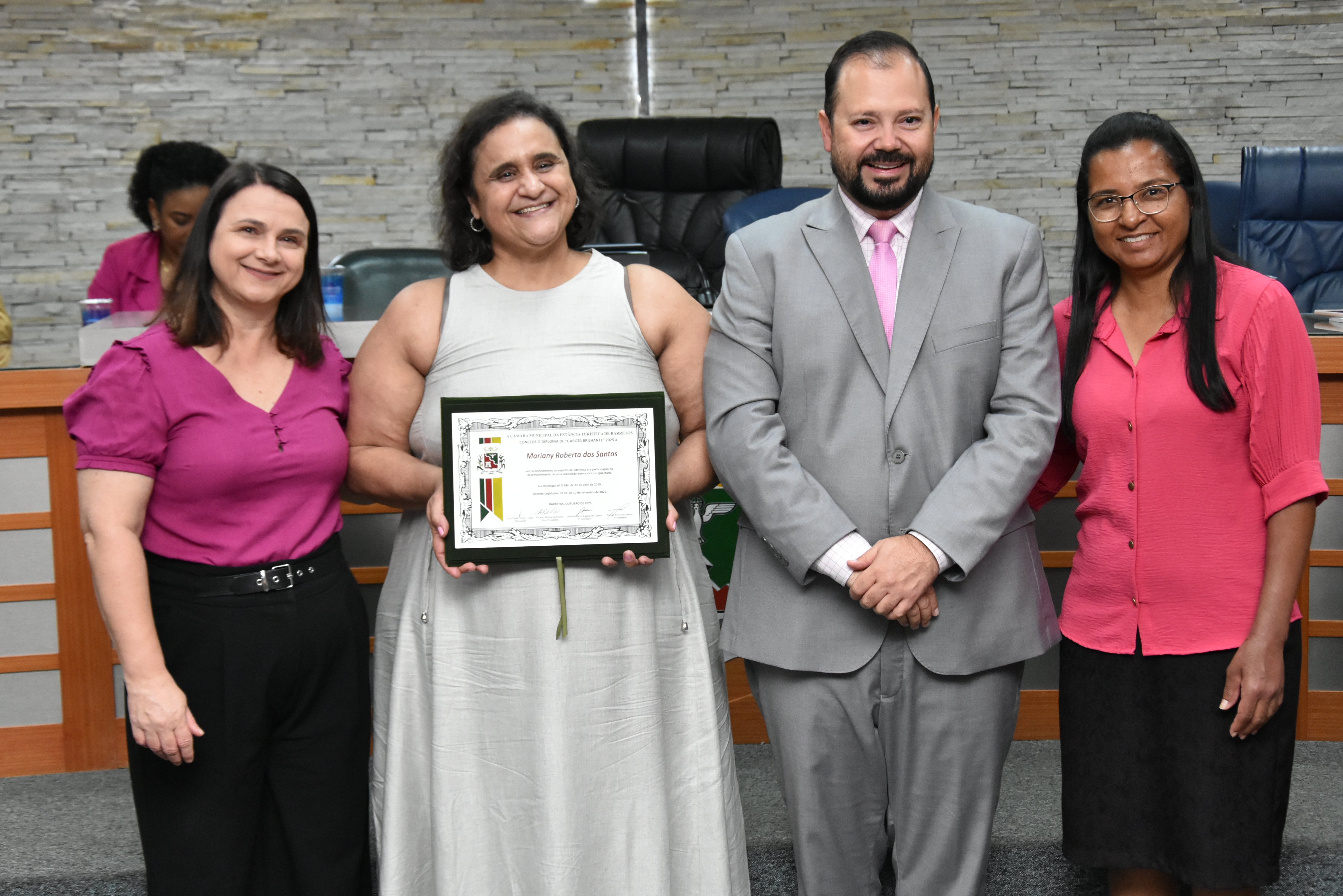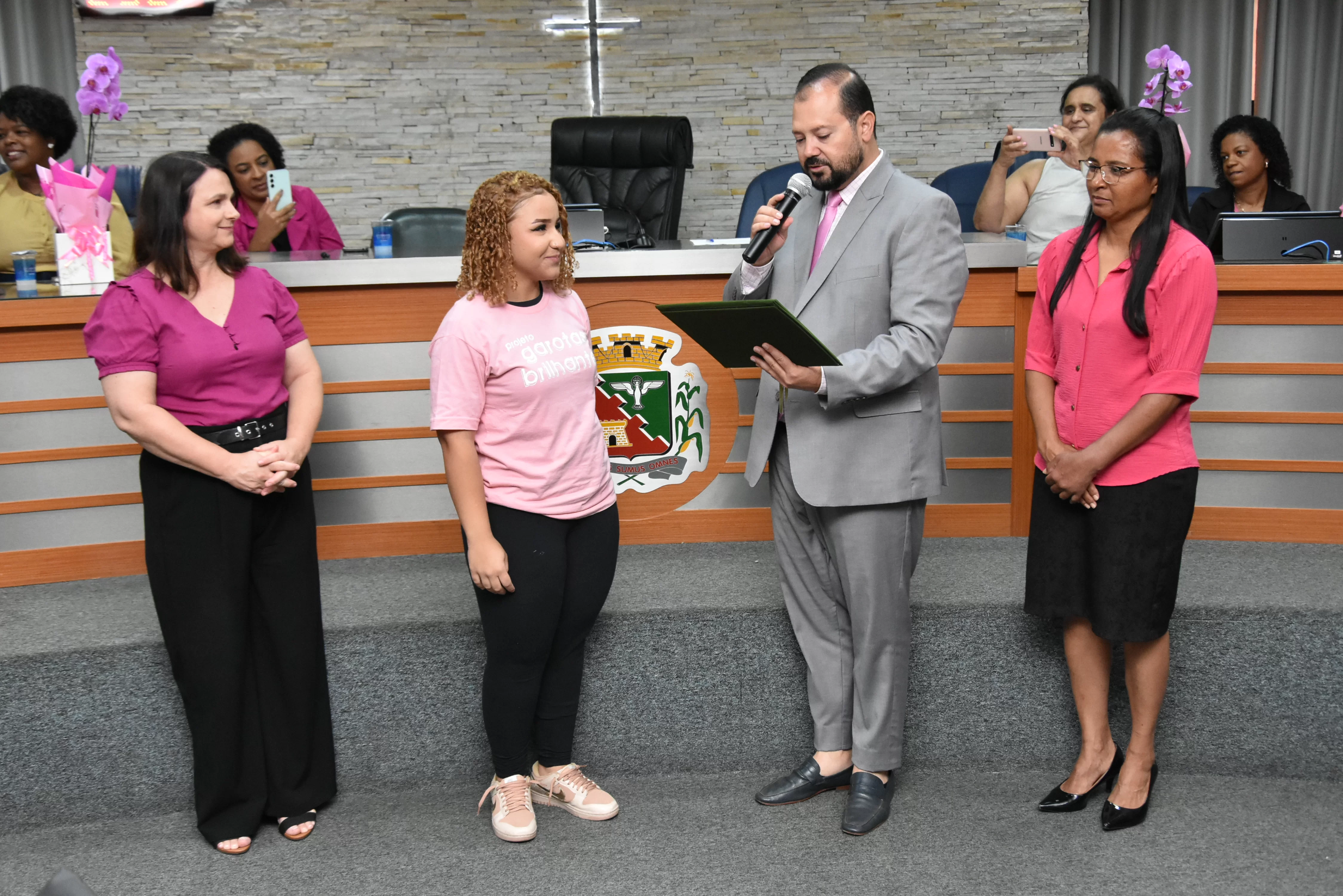 A solenidade foi conduzida pelo 2º Secretario da Câmara, Vereador Itamar Alves dos Santos (PSD) e contou ainda com presença do vereador Marcos Mariano (UNIÃO); da Coordenadora do CAAF -Centro Adventista de Apoio à Família de Barretos, Adriana Gonçalves Ferreira; da Assistente Social do Projeto Garotas Brilhantes, Pâmela Camargo; da Coordenadora Regional da ADRA - Agência Adventista de Desenvolvimento e Recursos Assistenciais, Estela Maris Miller Reis; da Diretora da Escola Estadual Mario Vieira Marcondes (local onde funciona o projeto Garotas Brilhantes); Marta Regina Rocha, Secretária Municipal de Assistência Social e Desenvolvimento Humano, Juliana Adão.