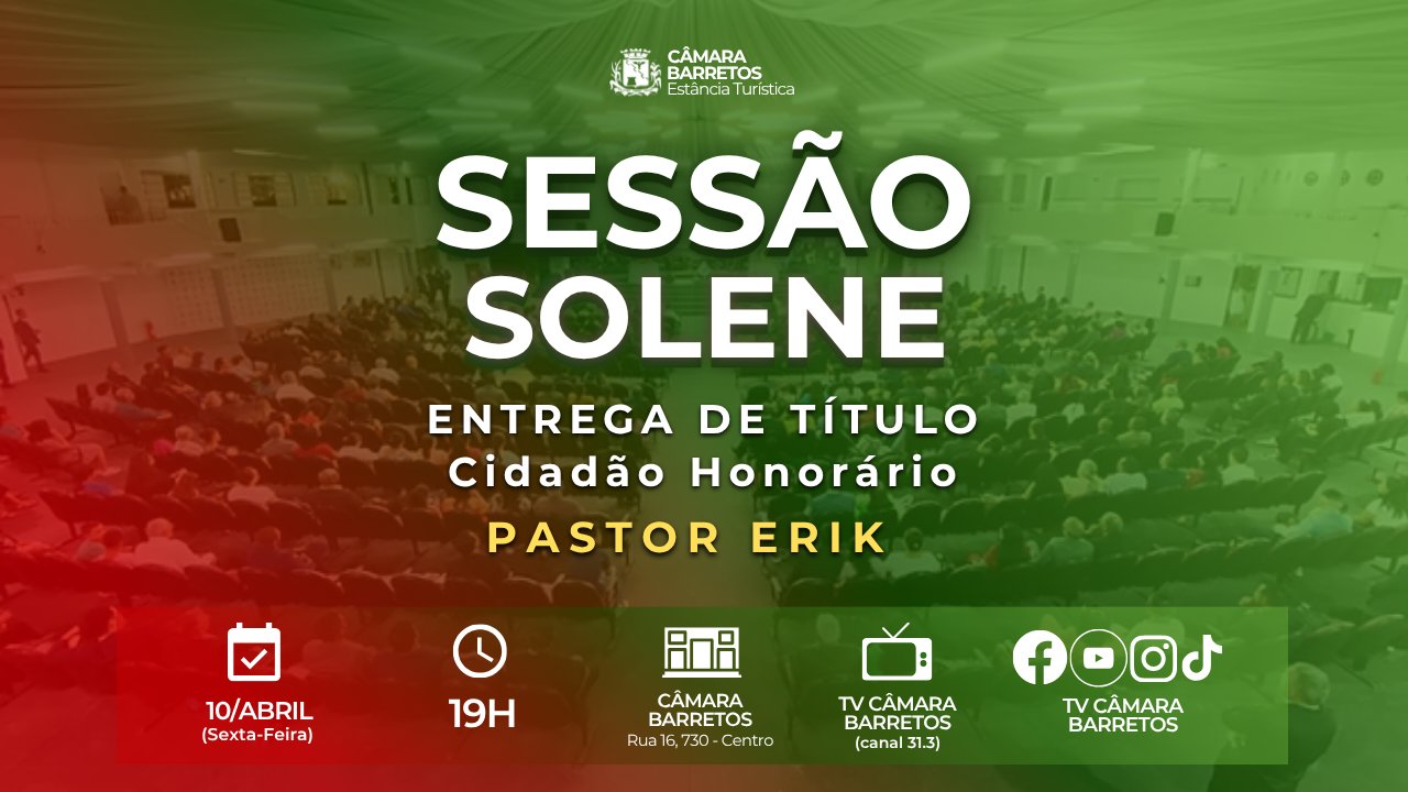 A Câmara Municipal de Barretos realiza no dia 10 de abril (sexta-feira), às 19h, Sessão Solene para entrega do Título de Cidadão Honorário da Estância Turística de Barretos ao Pastor Erik Washington de Lima, Pastor da Assembleia de Deus Ministério do Belém Campo de Barretos.