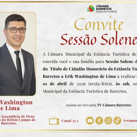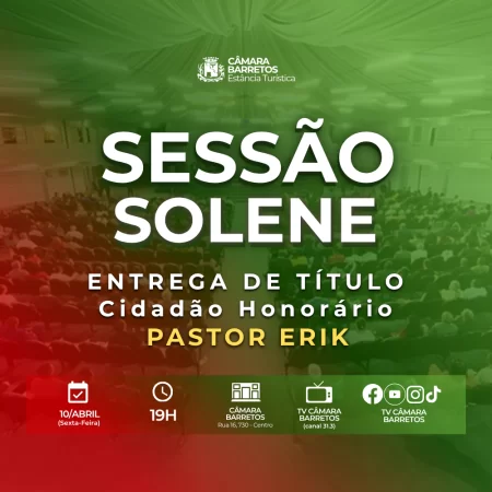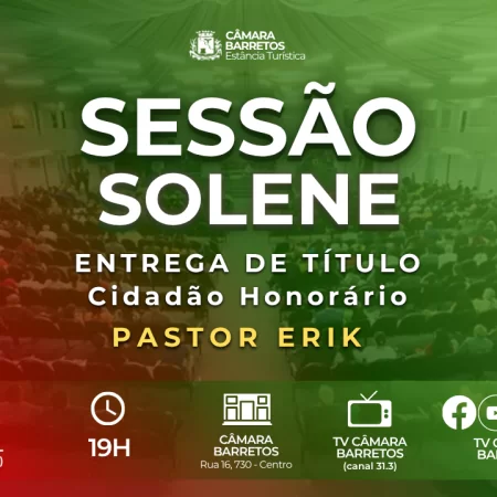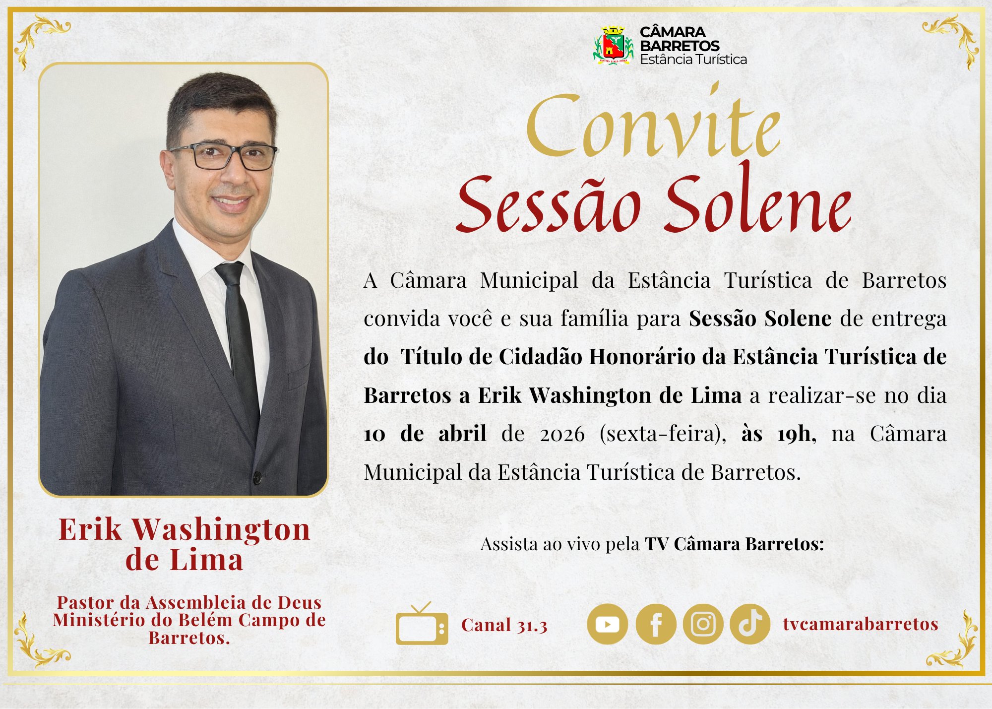 A Câmara Municipal de Barretos realizará no dia 10 de abril (sexta-feira), às 19h, Sessão Solene para entrega do Título de Cidadão Honorário da Estância Turística de Barretos ao Pastor Erik Washington de Lima, Pastor da Assembleia de Deus Ministério do Belém Campo de Barretos.