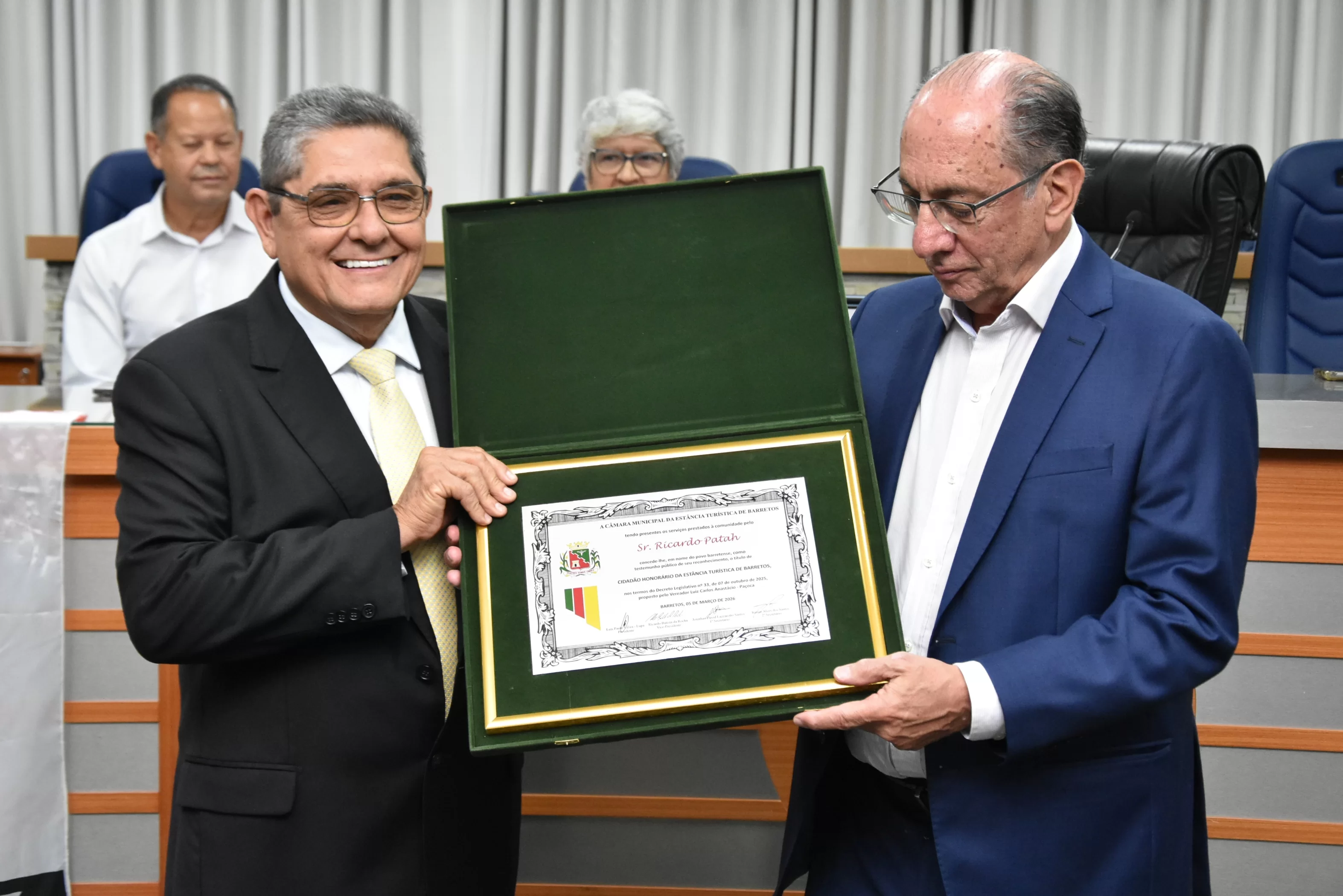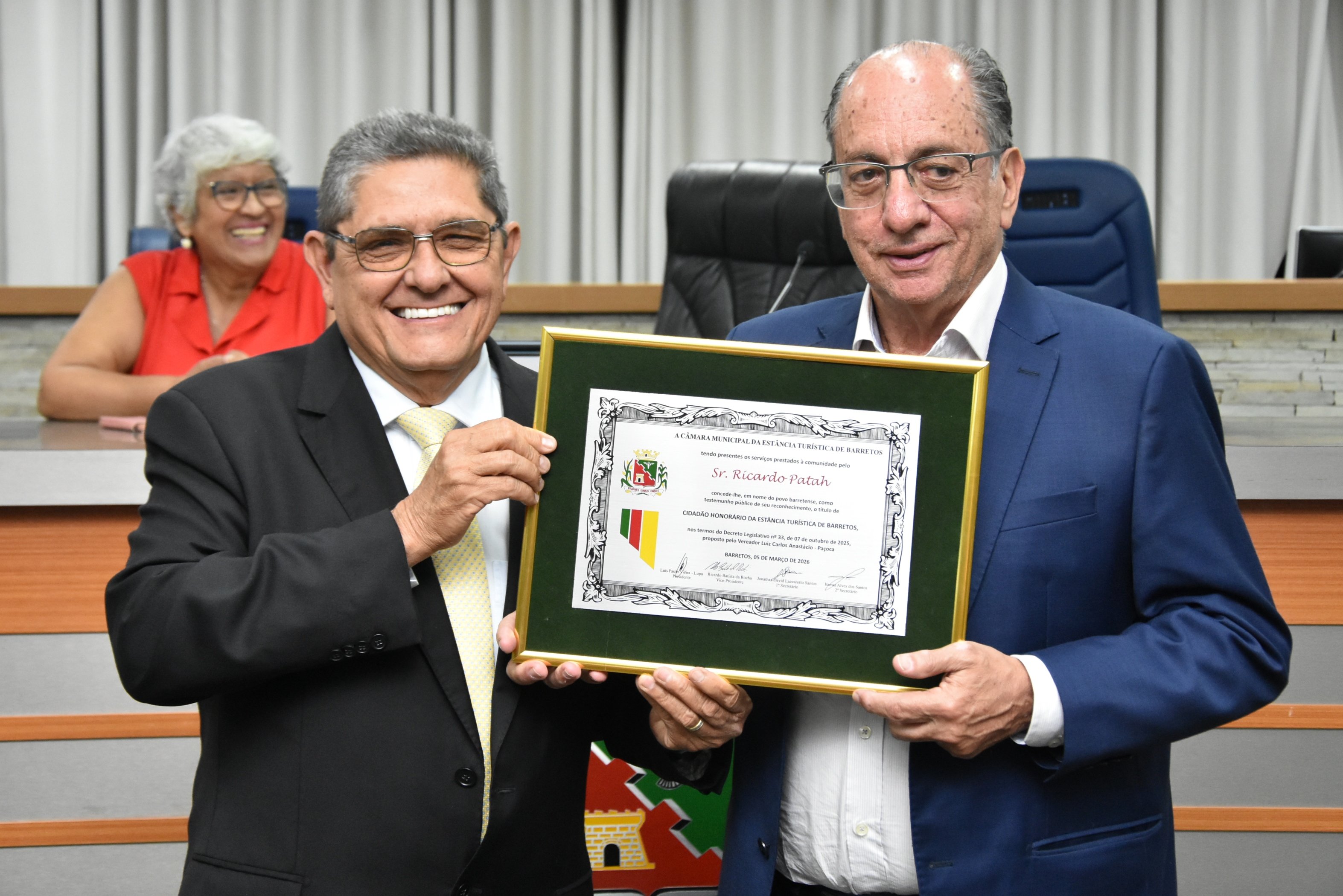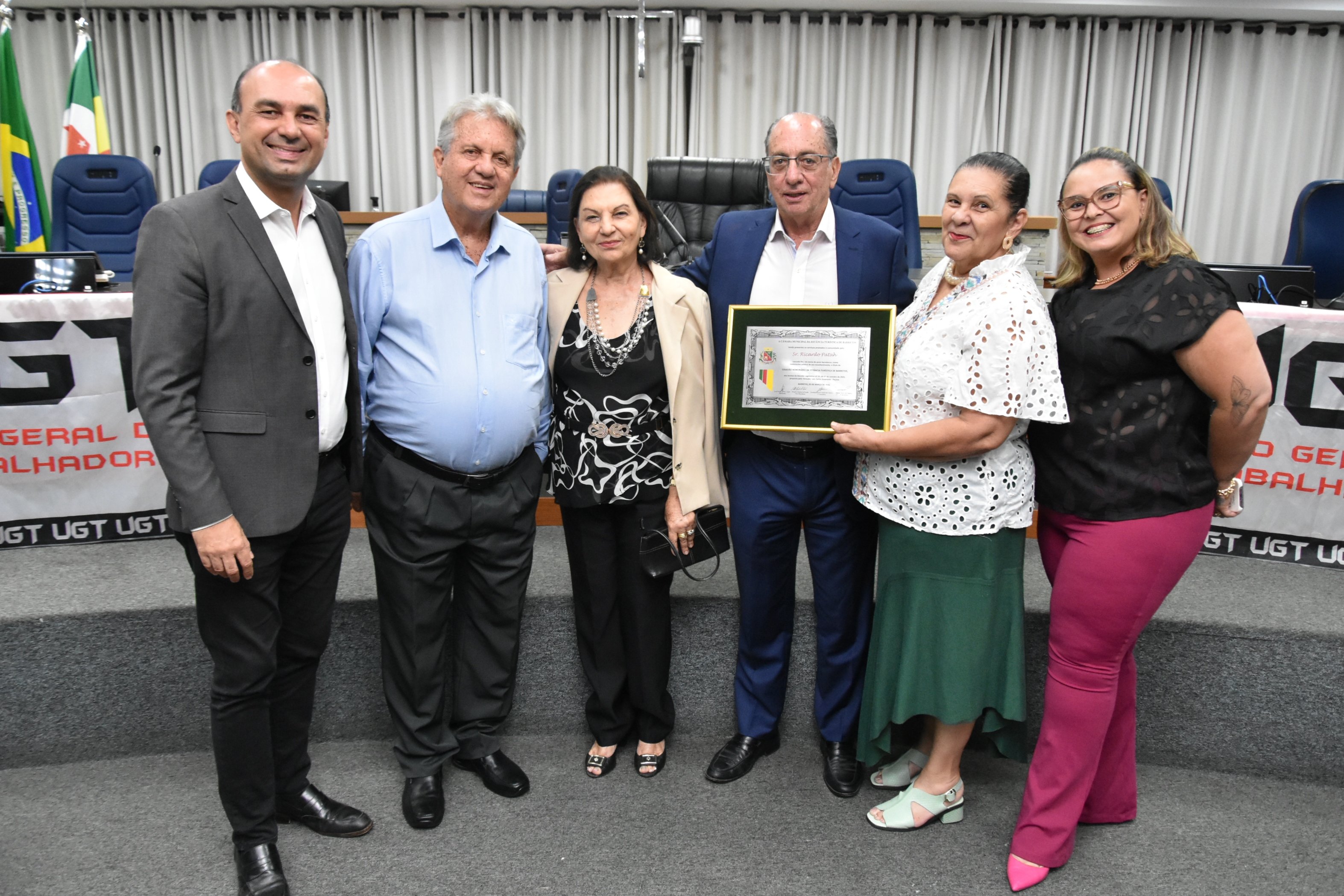 A Câmara Municipal de Barretos realizou na noite do dia 05 de março (quinta-feira), Sessão Solene para entrega do Título de Cidadão Honorário da Estância Turística de Barretos ao Sr. Ricardo Patah, Presidente Nacional da União Geral dos Trabalhadores (UGT) e também do Sindicato dos Comerciários de São Paulo.
