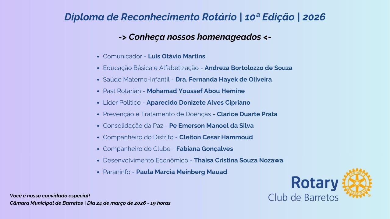 Durante a solenidade, o Rotary Club de Barretos, atualmente presidido por Rose Fontes Dalkirane, fará a entrega do Diploma Reconhecimento Rotário 10ª Edição, a personalidades de 11(onze) segmentos: Saúde Materno Infantil, Companheiro do Distrito, Past Rotarian , Líder político, Desenvolvimento Econômico, Educação Básica e Alfabetização, Consolidação da Paz, Companheiro do Clube, Comunicador, Prevenção e tratamento de doenças, além do Paraninfo.