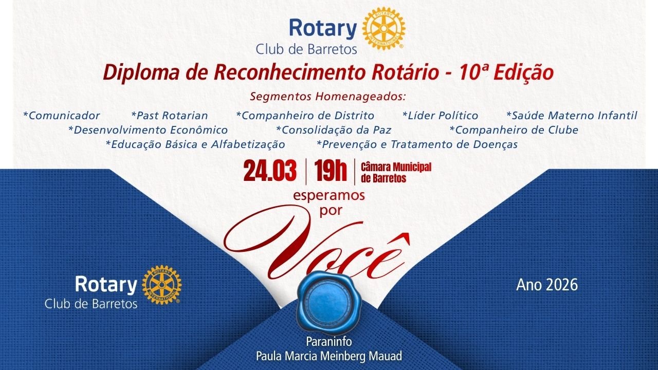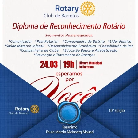 Rotary Club de Barretos fará a entrega do Diploma de Reconhecimento Rotário 10ª Edição a personalidades de segmentos da comunidade