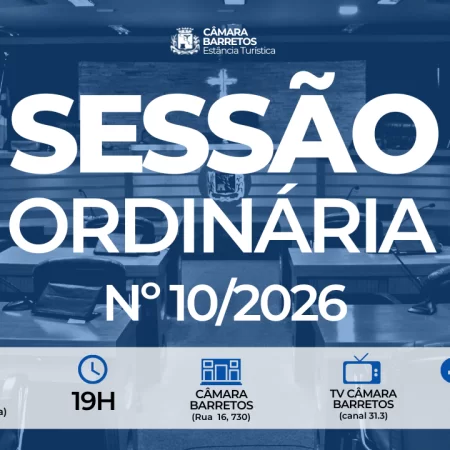 A Câmara de Barretos realizará na segunda-feira (13/abril), às 19h, a 10ª Sessão Ordinária de 2026. Ao todo serão discutidas e votadas 06 matérias: 1 Redação Final, 2 Projetos de Lei, 1 Projeto de Decreto Legislativo e 1 Parecer de inconstitucionalidade.