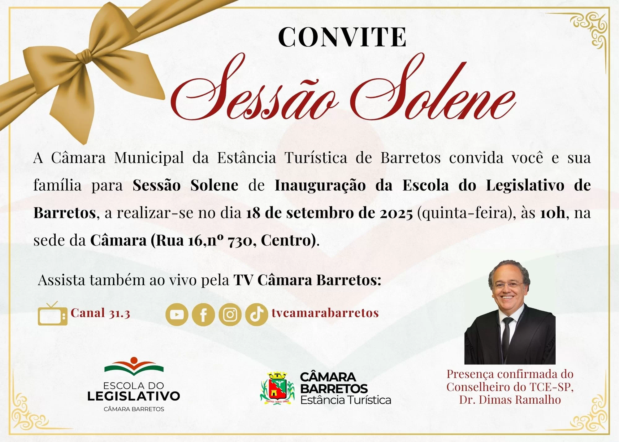 Todas as atividades da Escola serão divulgadas nos canais oficiais da Câmara de Barretos: site, Facebook, Youtube, Instagram e TV Câmara - canal 31-3.