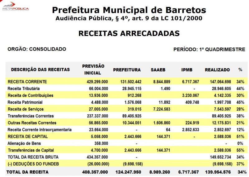 De acordo com informações apresentadas pelo consultor Gaspar da Costa e pelo contador, Milton Ferreria Filho, durante os quatro primeiros meses de 2015 o Município arrecadou (receitas) R$ 139.954.576,00 dos R$ 408.357.000,00 previstos no Orçamento para 2015 e gastou (despesas) R$188.997.588,00.