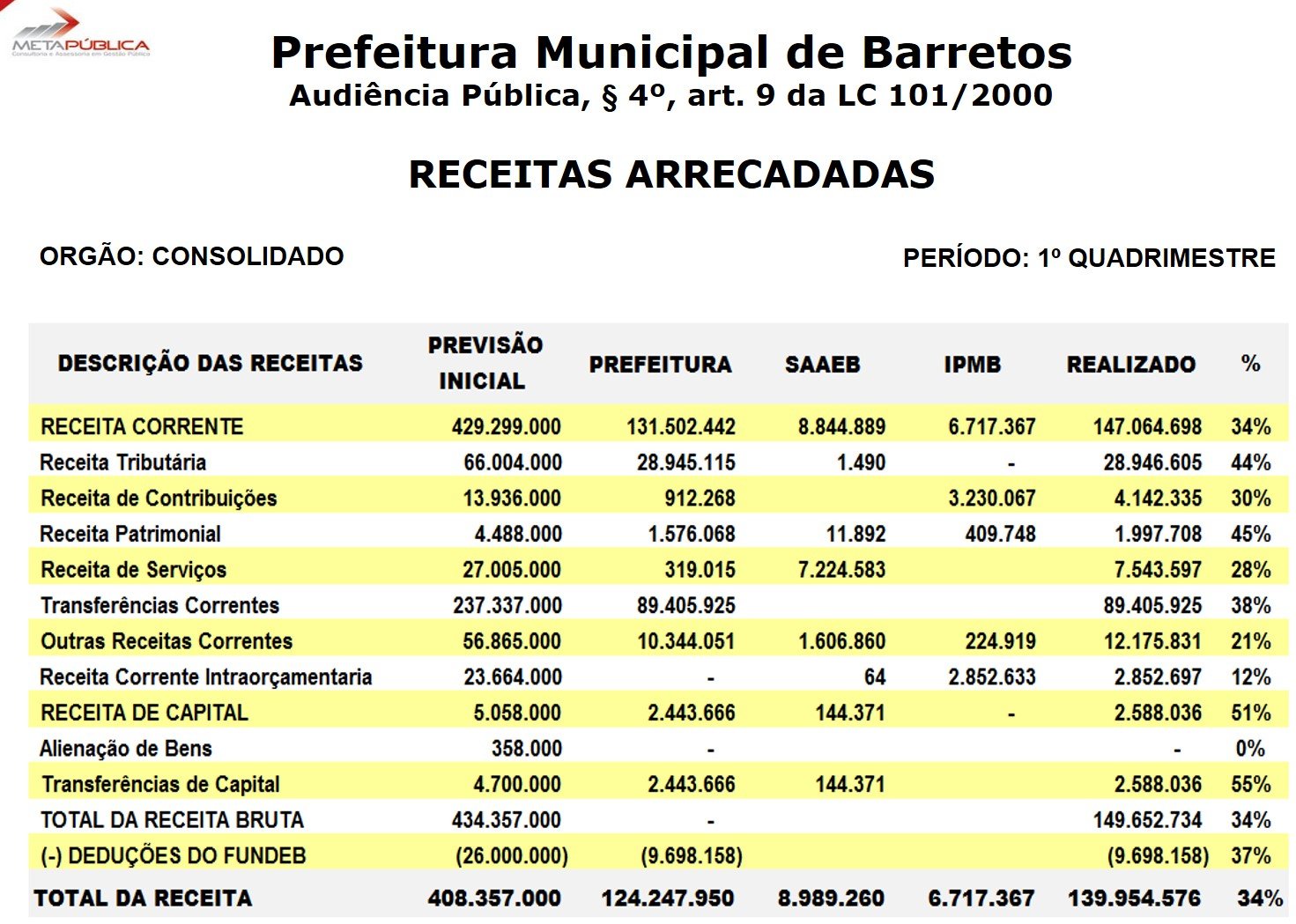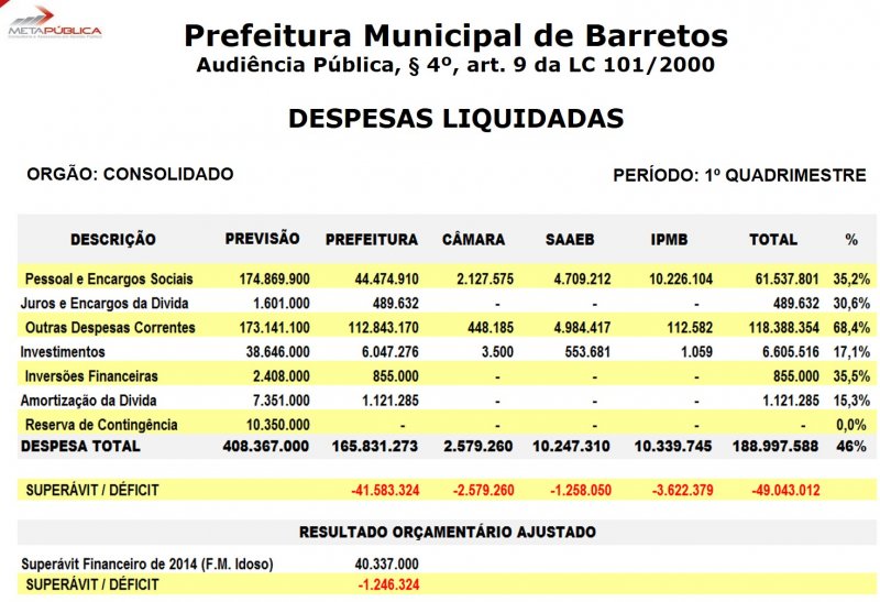 Dados apresentados mostram que o Município terminou o 1º quadrimestre com um déficit de R$ 49.043.012,00