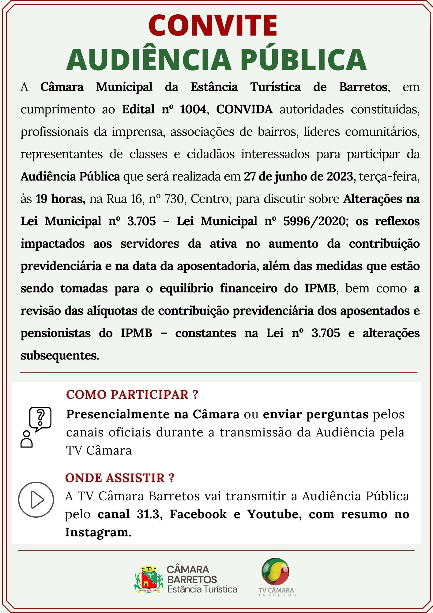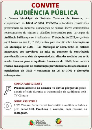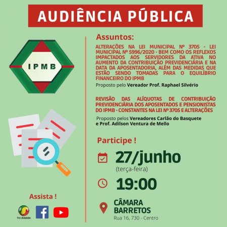 A Câmara de Barretos realiza no dia 27 de junho (terça-feira), às 19h, a Audiência Pública (aberta à participação da comunidade) para debater questões ligadas ao IPMB - Instituto de Previdência do Município de Barretos.