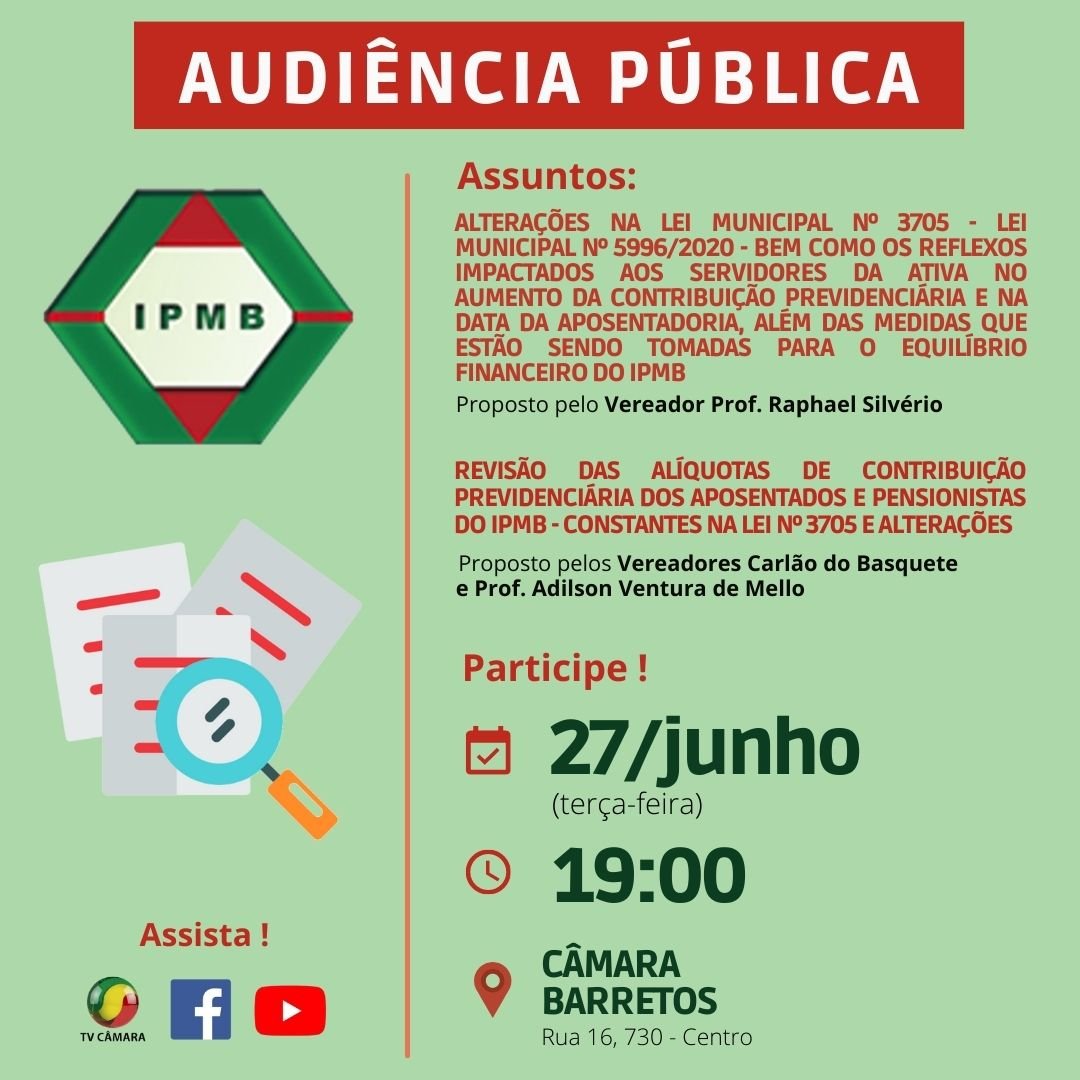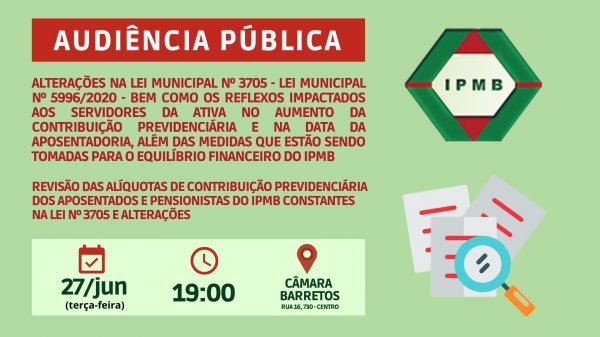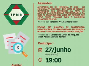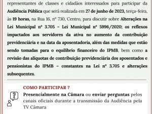 Tema da Audiência Pública: Alterações na Lei Municipal nº 3.705 (mediante a Lei Municipal nº 5996/2020); os reflexos impactados aos servidores da ativa no aumento da contribuição previdenciária e na data da aposentadoria, bem como as medidas que estão sendo tomadas para o equilíbrio financeiro do IPMB.