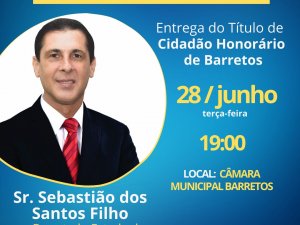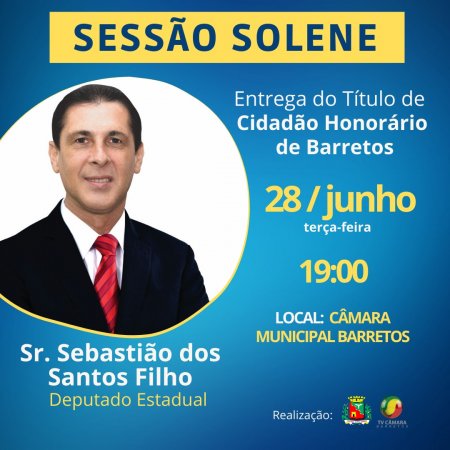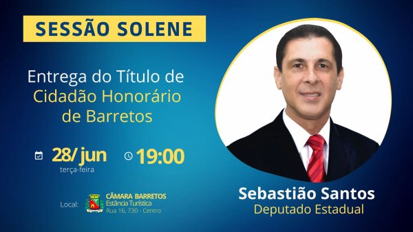 A Câmara agendou para esta terça-feira (28/jun), às 19h, Sessão Solene para a entrega do Título de Cidadão Honorário da Estância Turística de Barretos ao Deputado Estadual Sebastião Santos.