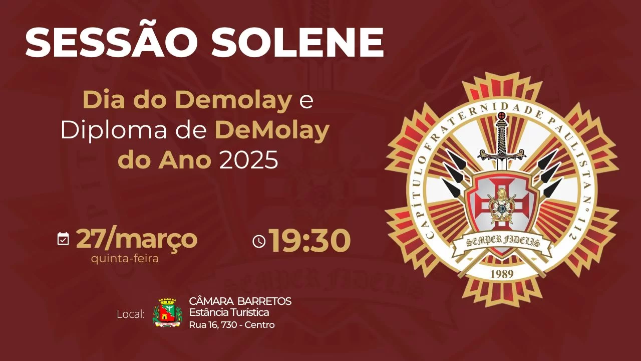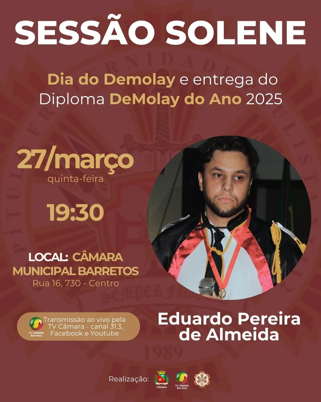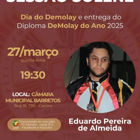 A Câmara de Barretos agendou para o dia 27 de mrço (quinta-feira), às 19h30, Sessão Solene em comemoração ao Dia do DeMolay e entrega do Diploma DeMolay do Ano 2025 ao jovem Eduardo Pereira de Almeida.