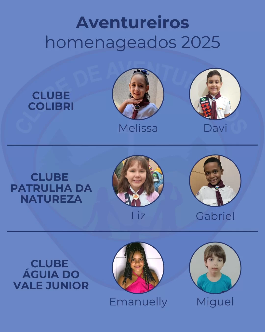 AVENTUREIROS: Melissa Moreira Araujo Cantarim e Davi Campos Marani (clube Colibri); Liz Fontoura de Faria Pedroso e Gabriel Henrique Gonçalves Sobrinho (clube Patrulha da Natureza); Emanuelly Victória dos Santos Luz e Miguel Carlos Silva de Jesus (clube Águia do Vale Júnior)