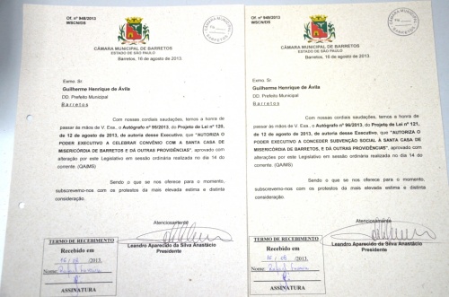 Com protocolo assinado por servidor do Executivo, a Prefeitura de Barretos recebeu na sexta-feira, 16 de agosto, os dois ofícios que confirmam que a Câmara Municipal aprovou os Projetos de Lei nº 120 e 121/2013 referentes ao convênio e repasse de verbas em favor da Santa Casa.