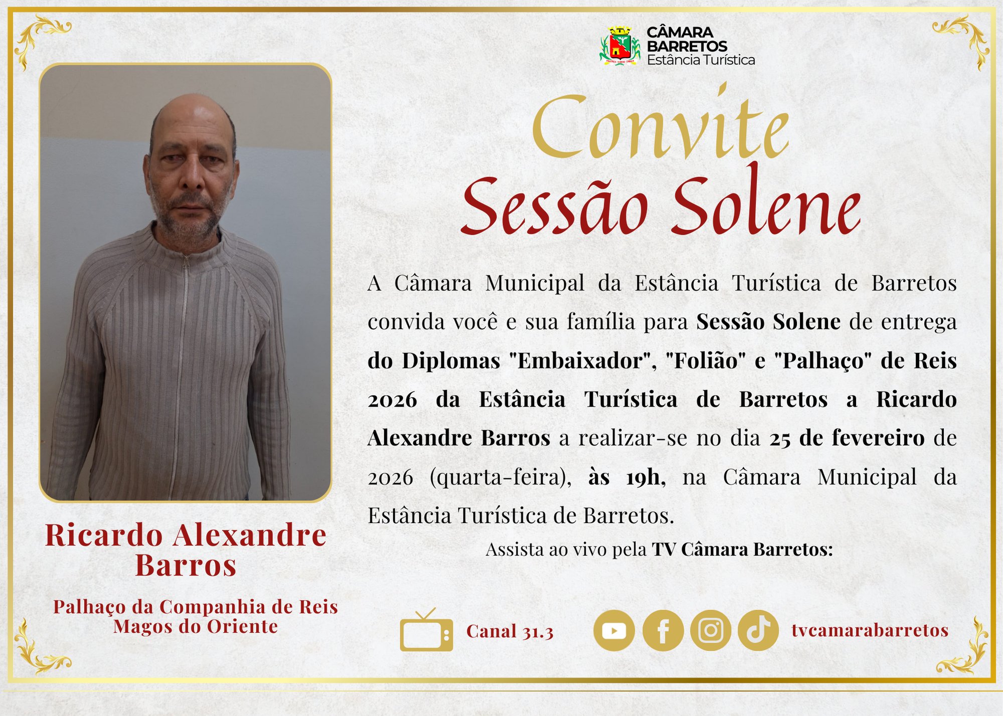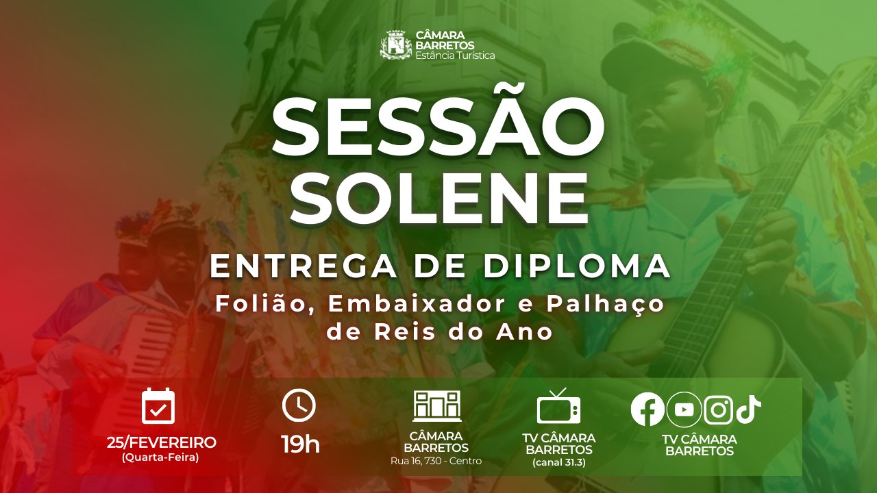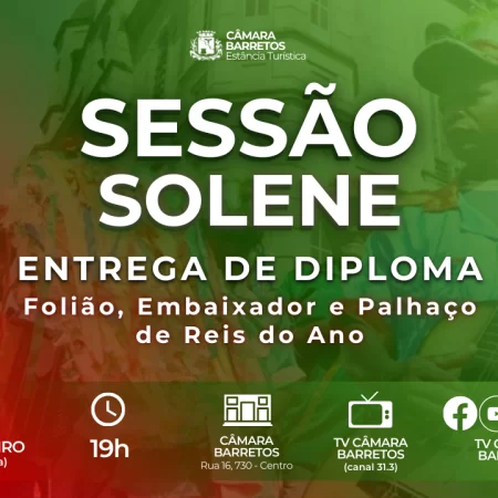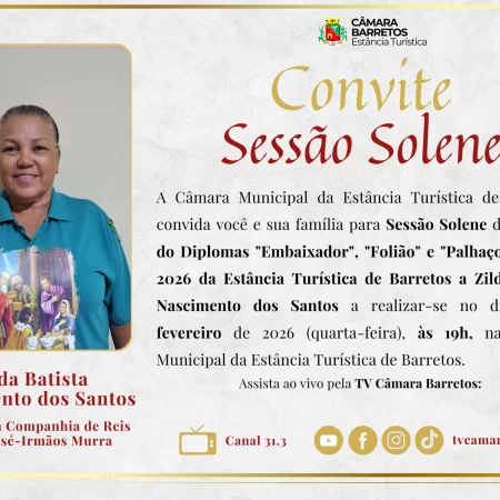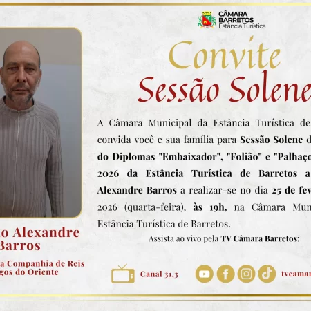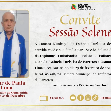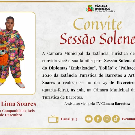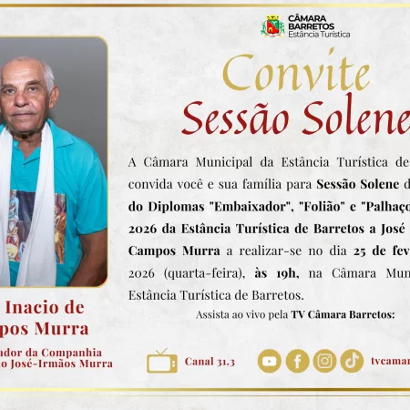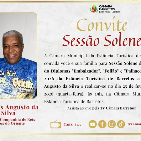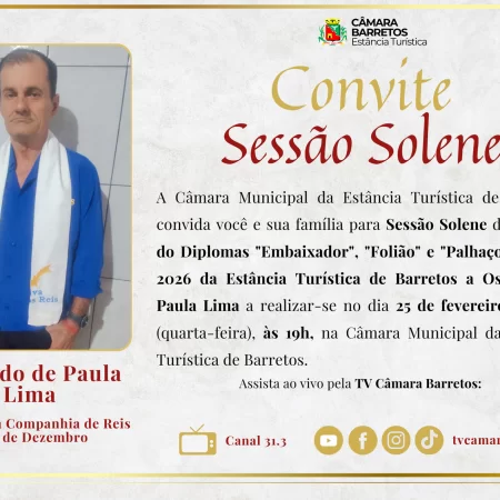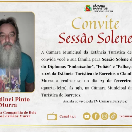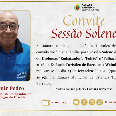 A Câmara de Barretos realizará no dia 25 de fevereiro (quarta-feira), às 19h, Sessão Solene para a entrega dos Diplomas "Embaixador", "Folião" e "Palhaço" de Reis 2026.