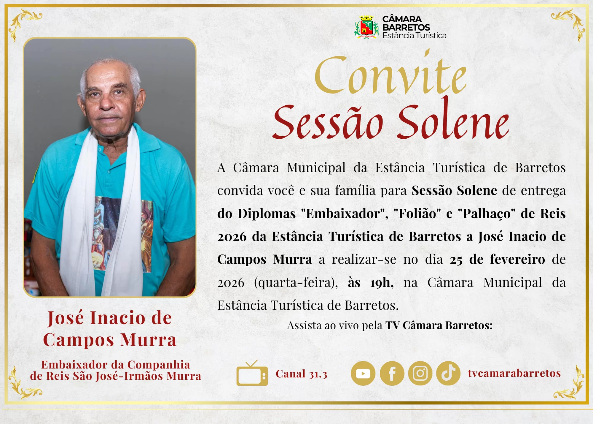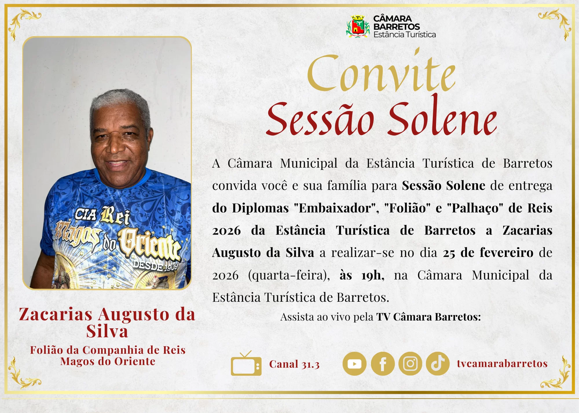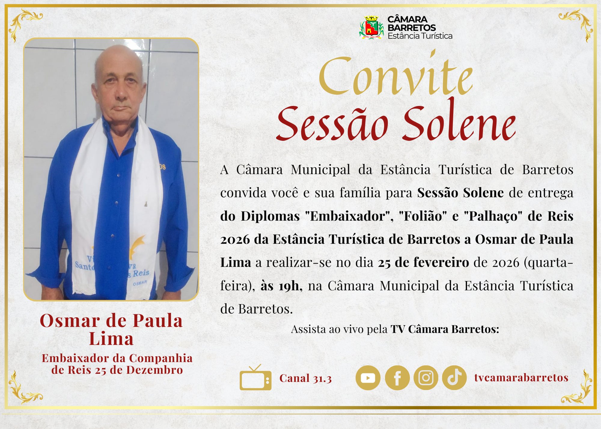 A Câmara de Barretos realizará no dia 25 de fevereiro (quarta-feira), às 19h, Sessão Solene para a entrega dos Diplomas "Embaixador", "Folião" e "Palhaço" de Reis 2026.