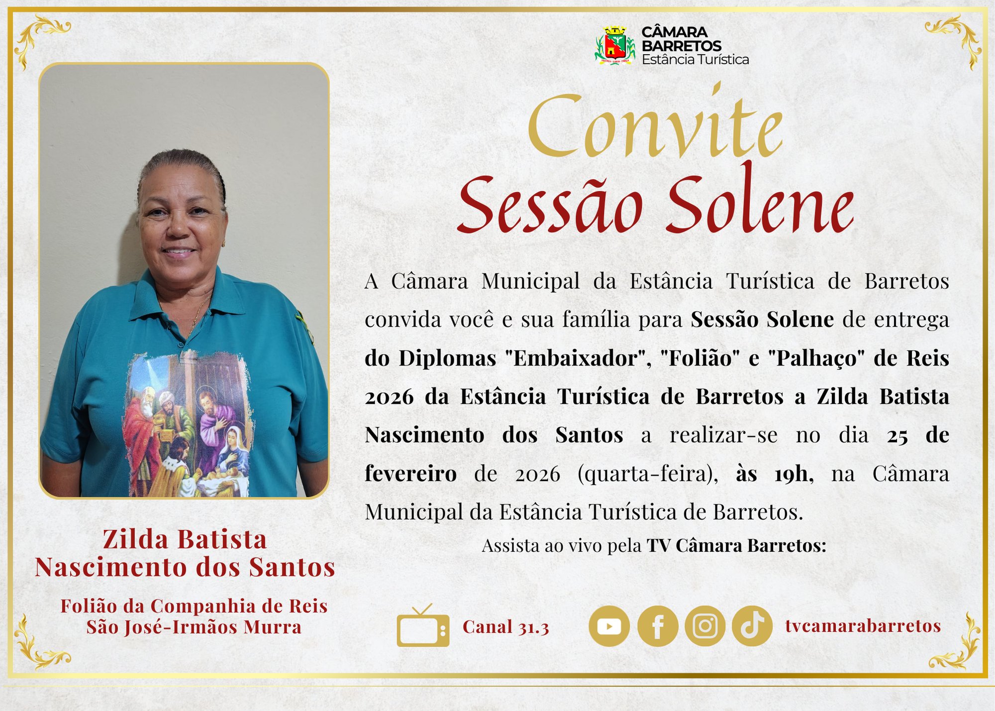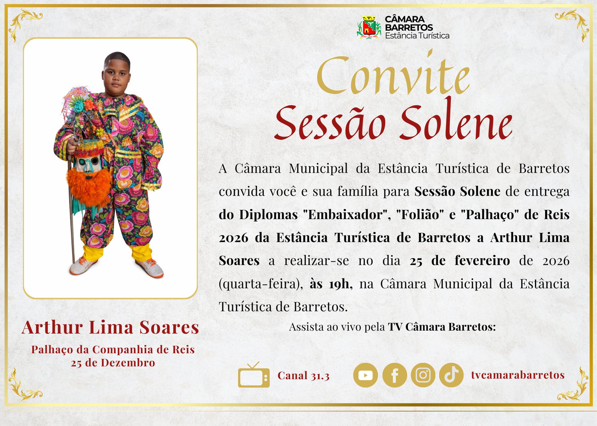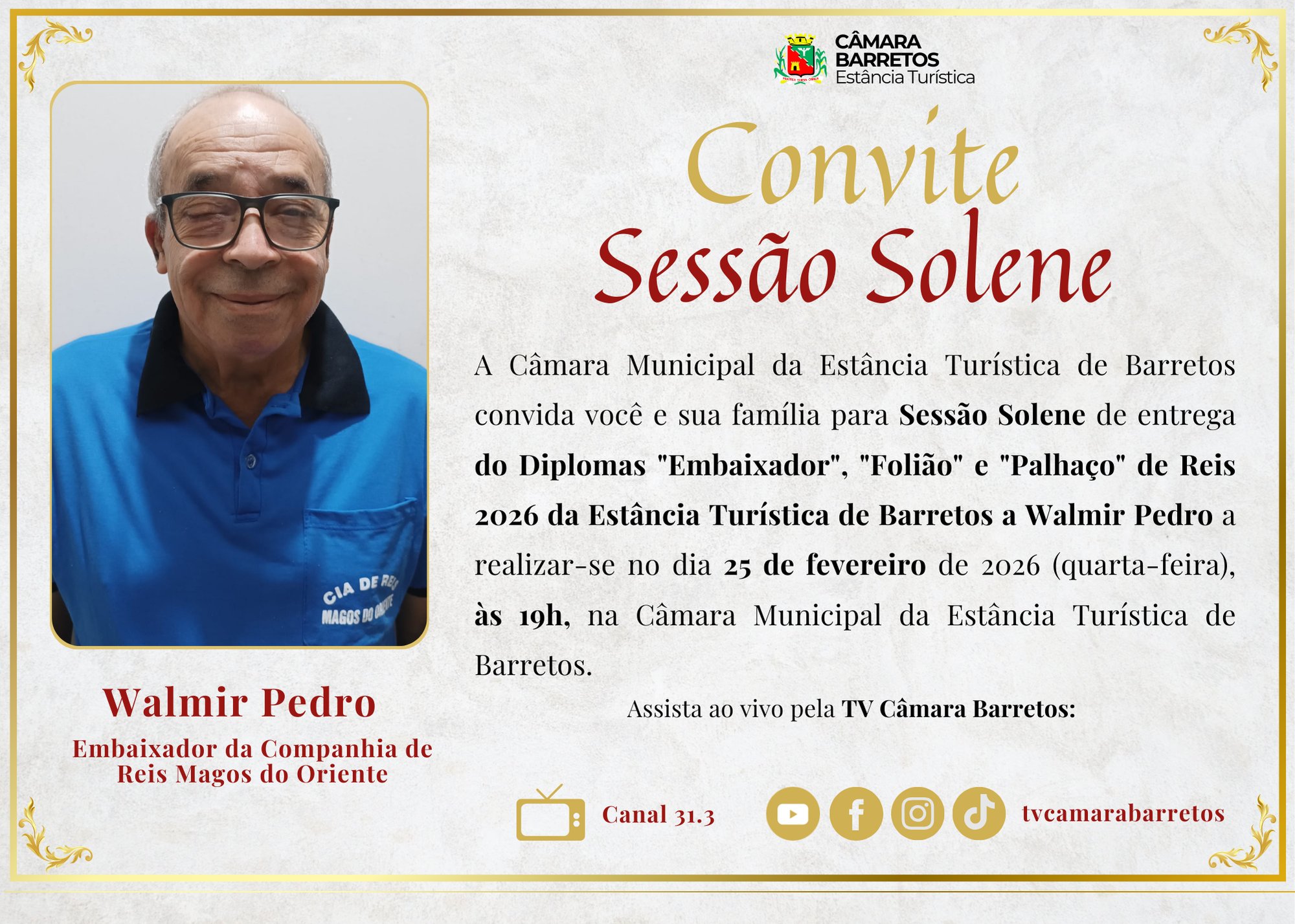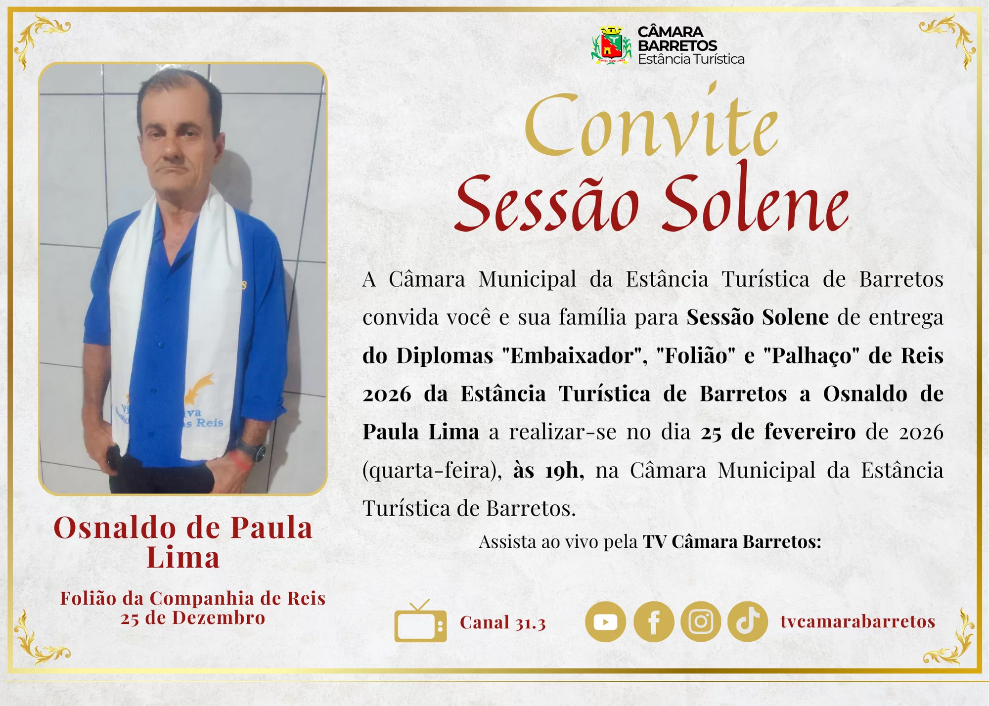 A Câmara de Barretos realizará no dia 25 de fevereiro (quarta-feira), às 19h, Sessão Solene para a entrega dos Diplomas "Embaixador", "Folião" e "Palhaço" de Reis 2026.