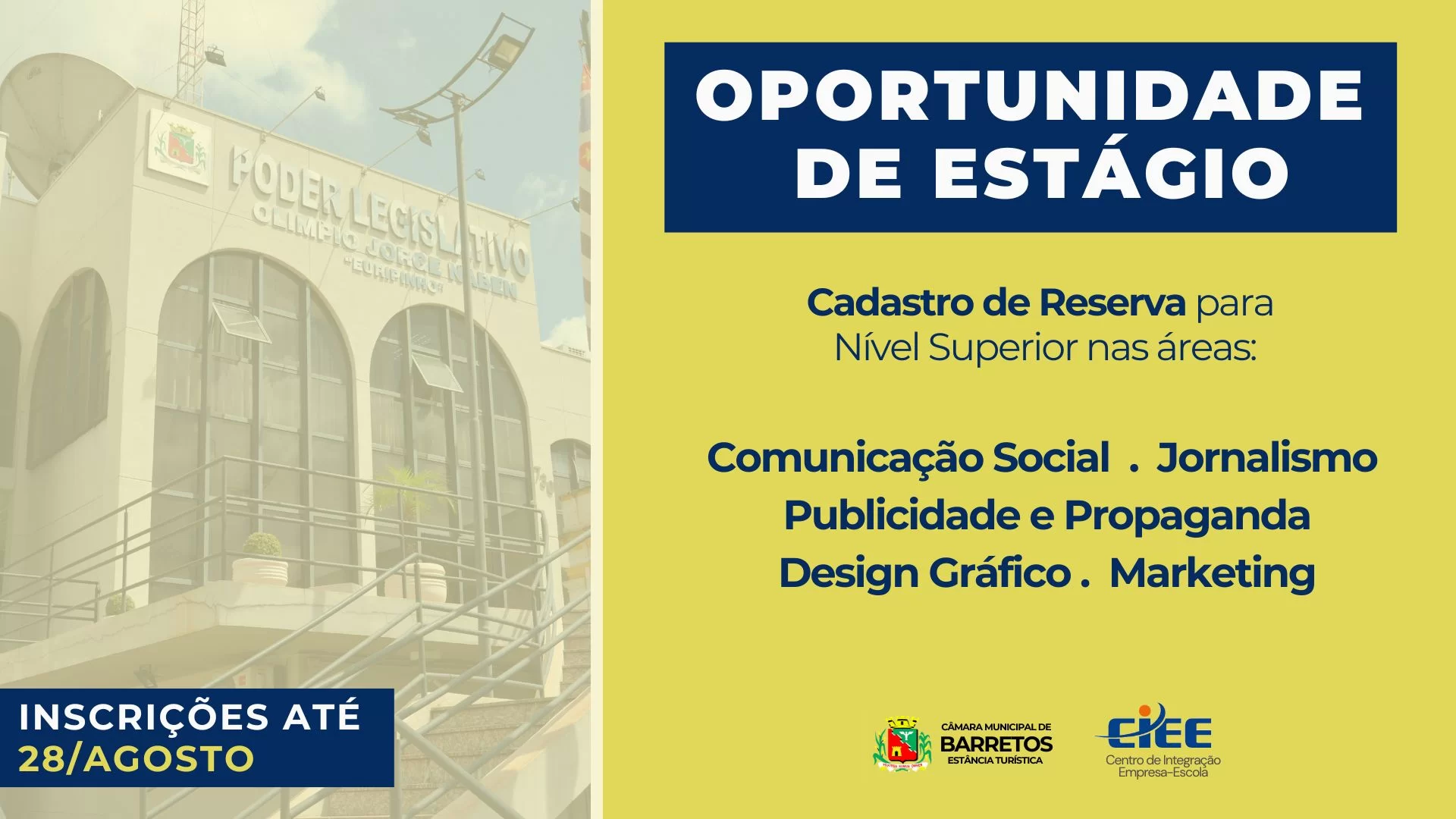 A Câmara Municipal da Estância Turística de Barretos, por meio do CIEE - (Centro de Integração Empresa-Escola) reabriu nesta quarta-feira (13/agosto), as inscrições para o Processo Seletivo visando a formação de cadastro de reserva para estagiários de nível superior nas áreas de Comunicação.