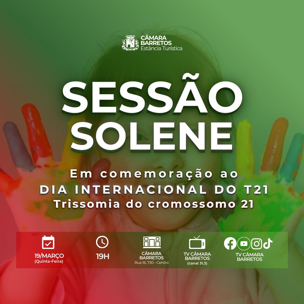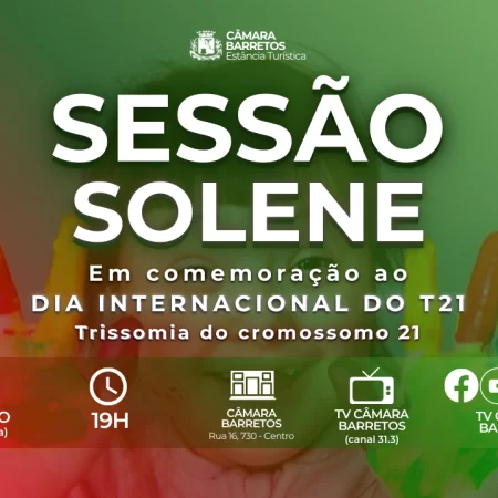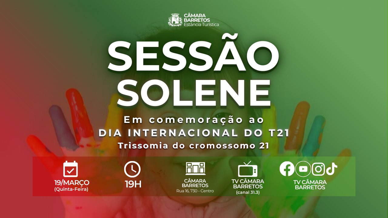 A Câmara de Barretos realizará no dia 19 de março (quinta-feira), das 19h, Sessão Solene para celebrar o Dia Internacional do T21 - Trissomia do Cromossomo 21.