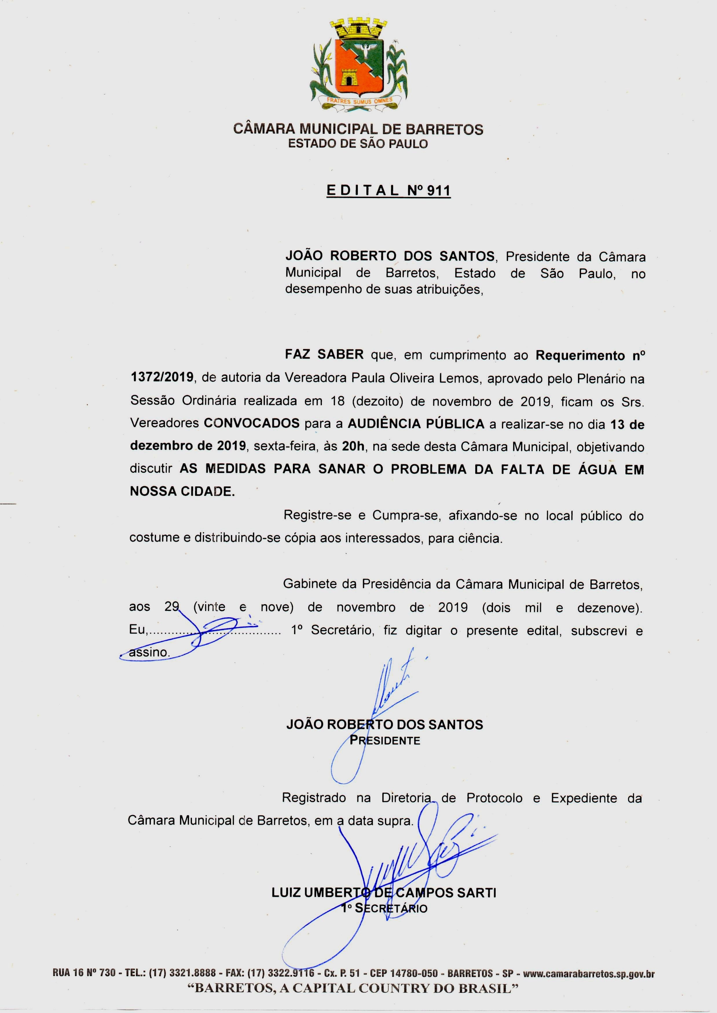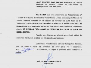 Na noite de sexta-feira, 13 dezembro, às 20h, a Câmara Municipal realiza a Audiência Pública para debater a falta de água em Barretos. O tema "AS MEDIDAS PARA SANAR O PROBLEMA DA FALTA DE ÁGUA EM NOSSA CIDADE" foi proposto pela Vereadora Paula Lemos (PSB), por meio da aprovação do Requerimento 1372/2019.