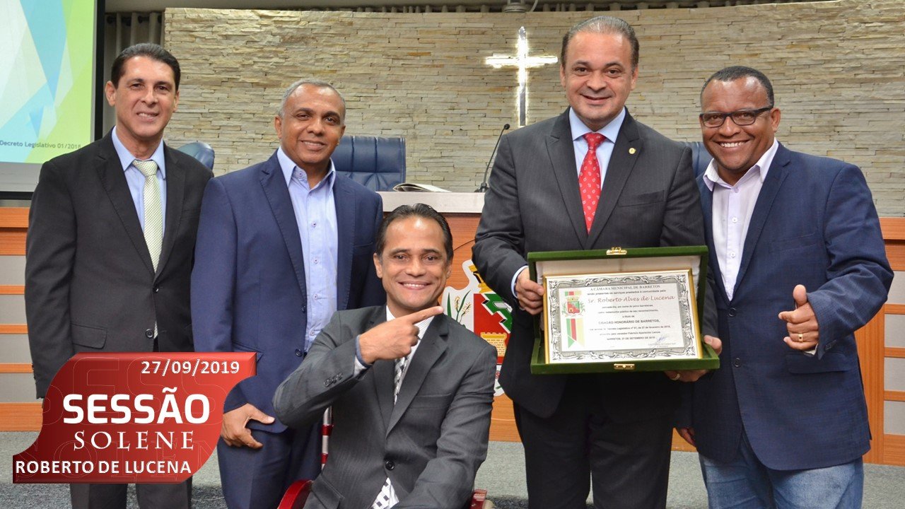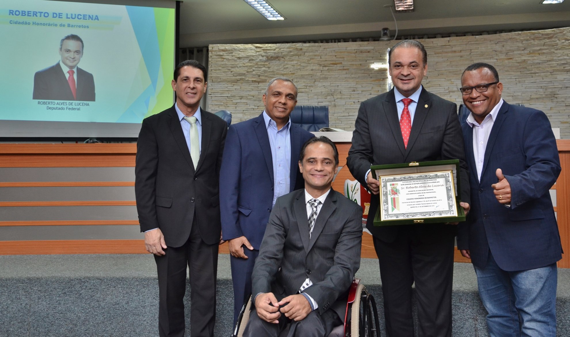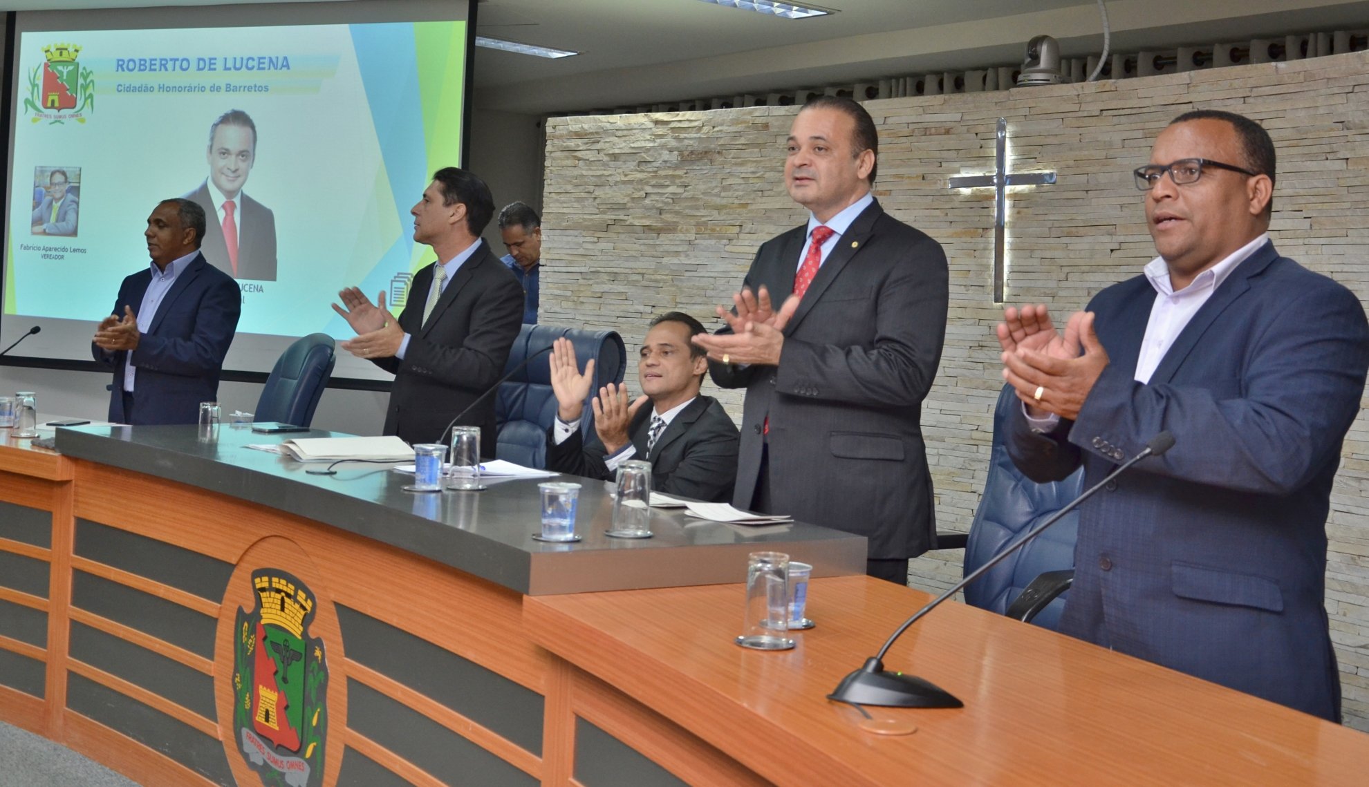 O Deputado Federal Roberto Lucena (PODE-SP) recebeu o Título de “Cidadão Honorário de Barretos” na noite desta sexta-feira (27), durante Sessão Solene na Câmara Municipal. A homenagem foi proposta pelo vereador Fabrício Lemos (PSL), por meio do Projeto de Decreto Legislativo nº 01/2018.