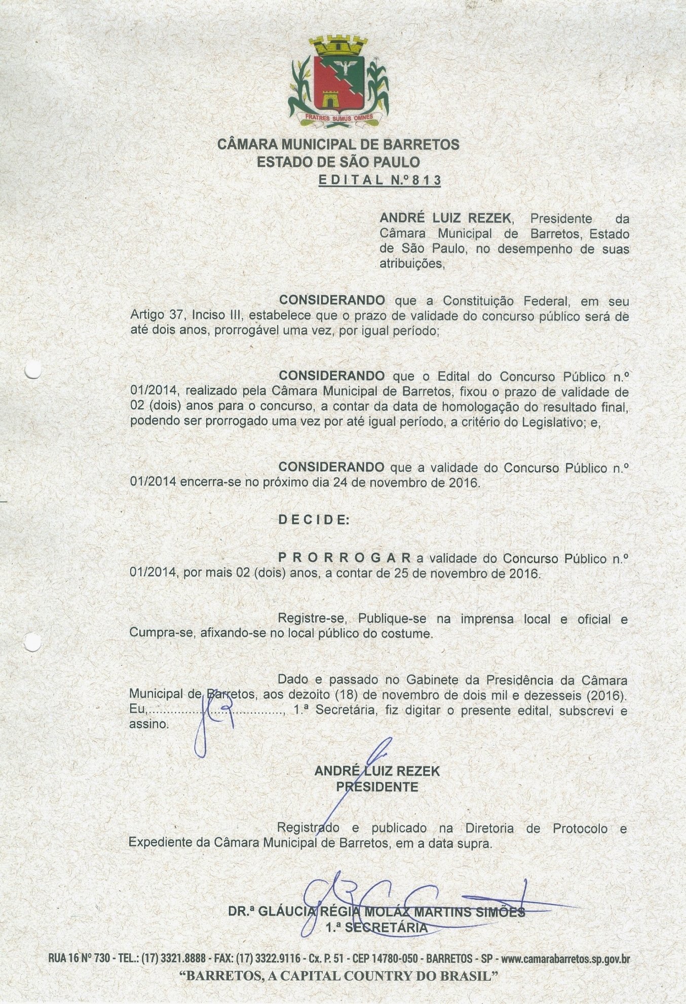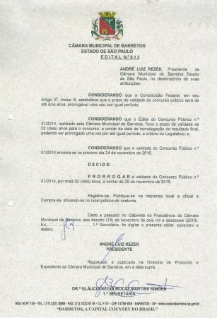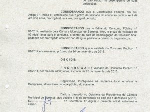 A Câmara Municipal de Barretos publicou nesta semana o Edital nº 813/2016, que prorroga o concurso público que foi realizado no ano de 2014 para o preenchimento de sete vagas no Legislativo.