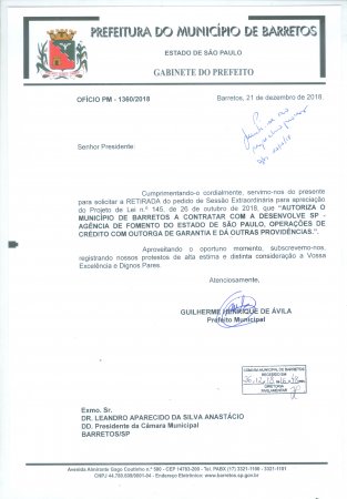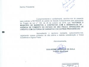 Já o Projeto de Lei nº 145/2018, que AUTORIZA O MUNICÍPIO DE BARRETOS A CONTRATAR COM A DESENVOLVE SP - AGÊNCIA DE FOMENTO DO ESTADO DE SÃO PAULO, OPERAÇÕES DE CRÉDITO COM OUTORGA DE GARANTIA E DÁ OUTRAS PROVIDÊNCIAS teve Pedido de Vista do vereador Sargento Cipriano (PP).