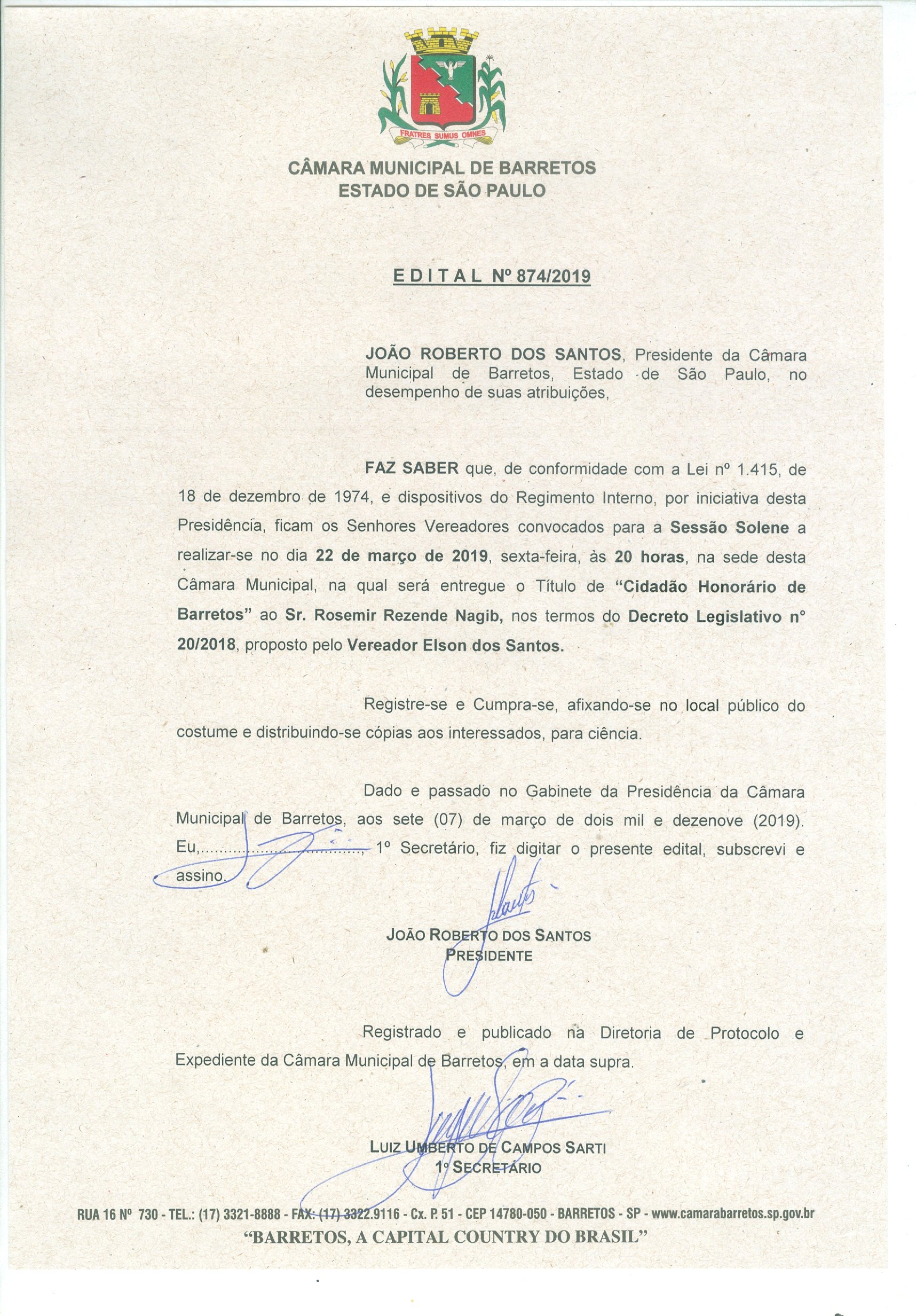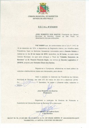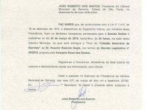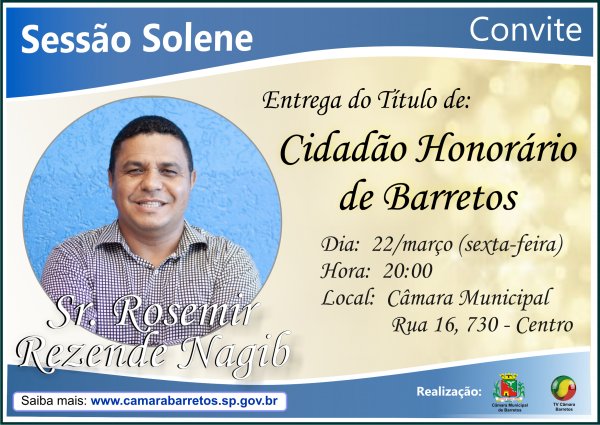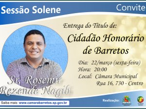 No próximo dia 22, sexta-feira, às 20h, acontece no plenário da Câmara Municipal a Sessão Solene para entrega do Título de Cidadão Honorário de Barretos ao Sr. Rosemir Rezende Nagib. A iniciativa da homenagem é do Vereador Elson dos Santos.