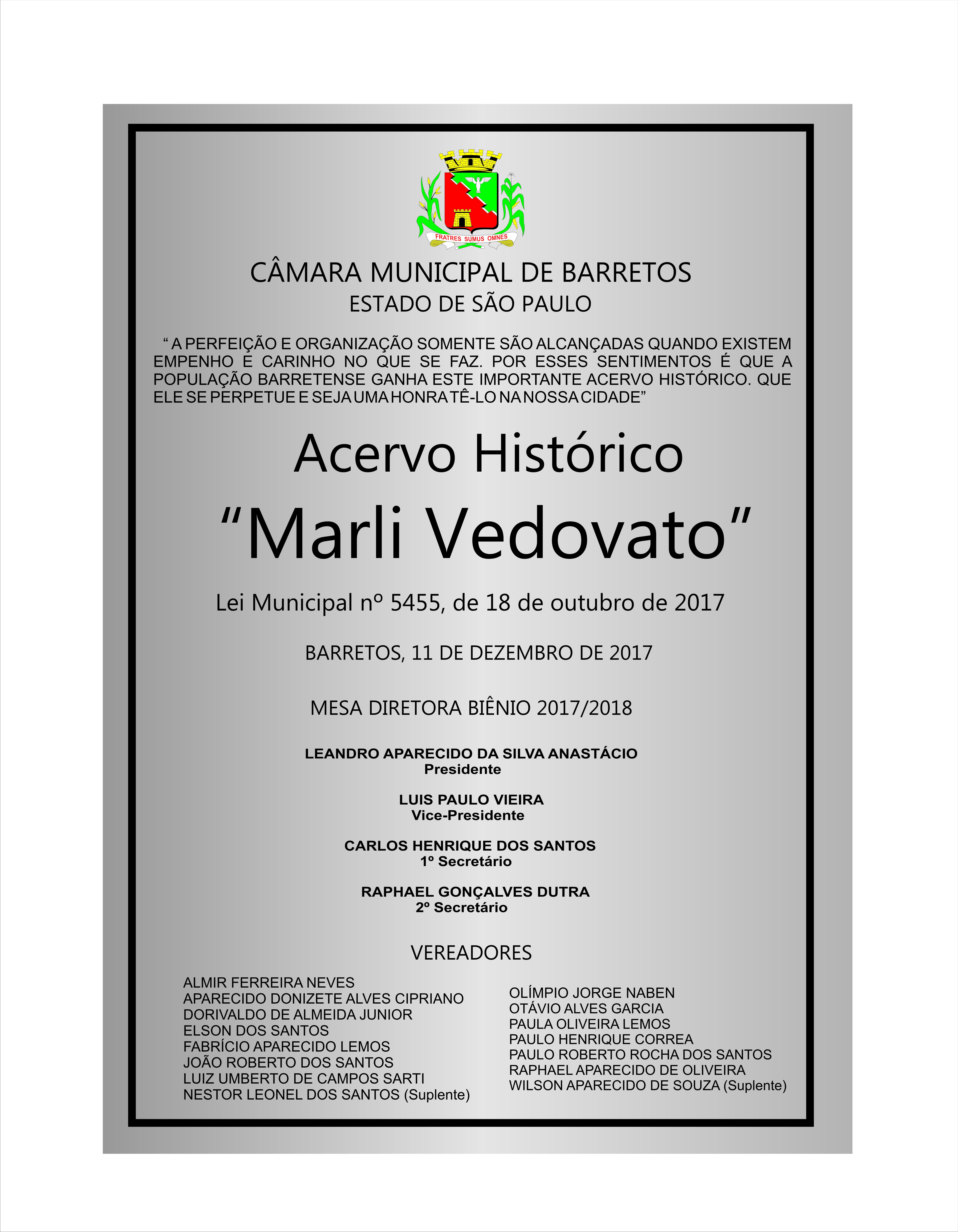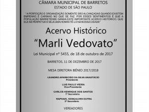 A denominação "Marli Vedovato" é uma homenagem à ex-servidora, falecida recentemente e que atuou por mais de 20 anos no Legislativo barretense e teve papel fundamental na elaboração de regras, estudos, renovação, gestão e implantação de todo o sistema do acervo.