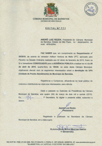 Veja aqui o Edital nº 771/2015, que convocava os vereadores para Audiência Pública no dia 08 de abril de 2015.