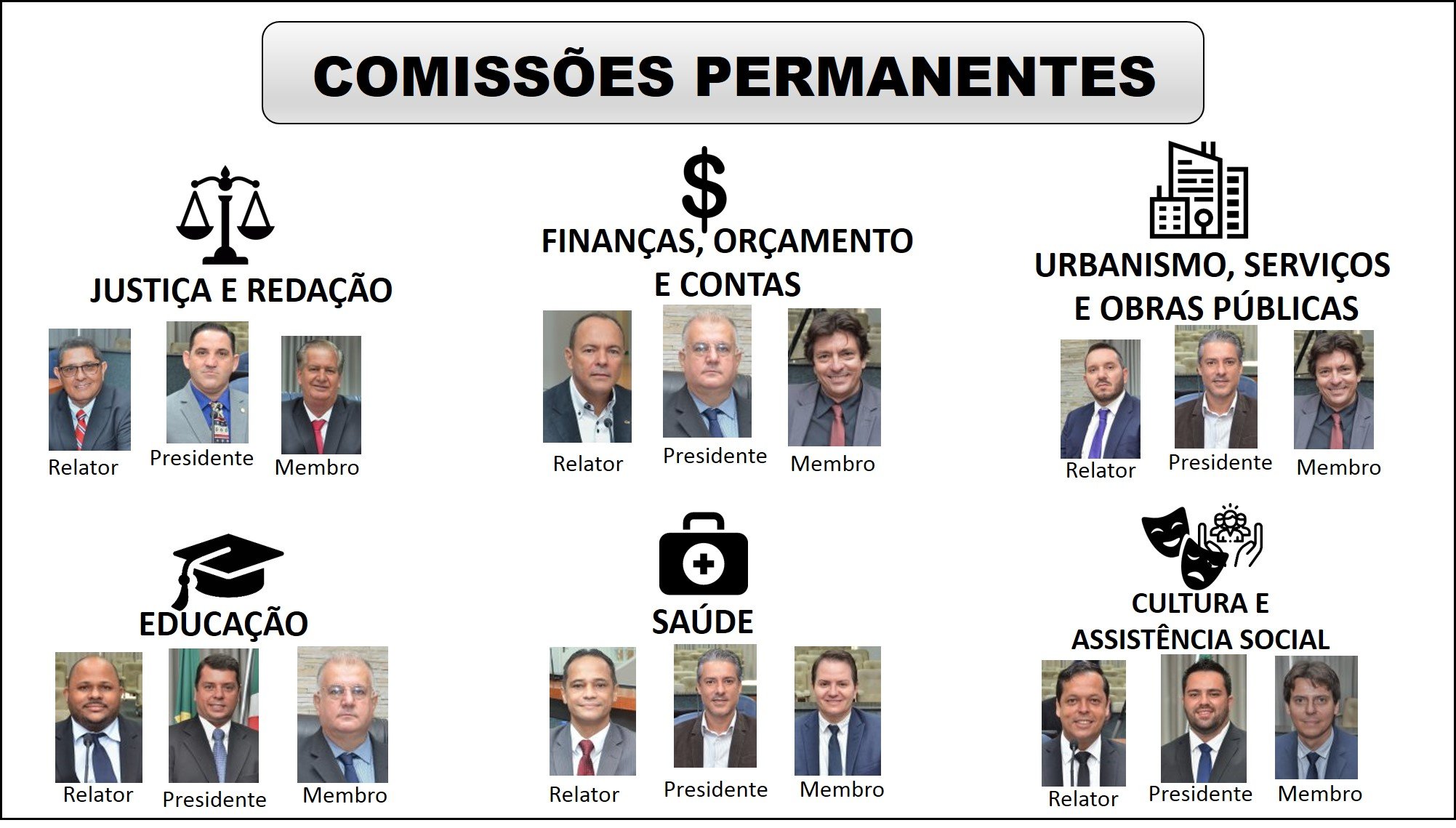 A Câmara possui seis COMISSÕES PERMANENTES: Justiça e Redação - Finanças, Orçamento e Contas - Urbanismo, Serviços e Obras Públicas - Saúde - Educação - Cultura e Assistência Social. Há ainda o Conselho de Ética e Decoro Parlamentar, que foi instituído por meio da Resolução nº 532/2015.