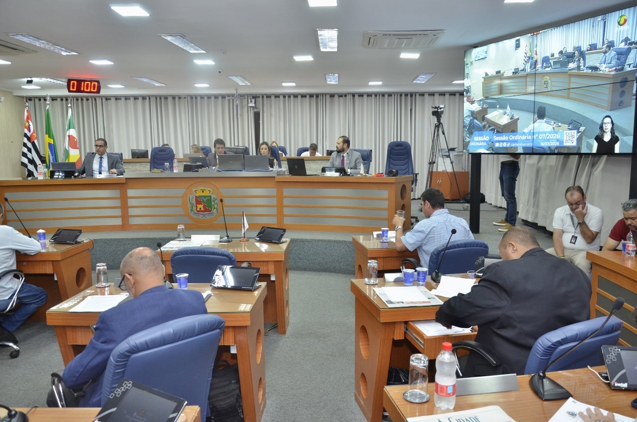 A Câmara de Barretos realizou na noite de segunda-feira (16/março), a 7ª Sessão Ordinária de 2026. Foram discutidas e votadas 16 matérias: 9 Projetos de Lei, 4 Projetos de Decreto Legislativo, 1 Projeto de Lei Complementar e 2 Pareceres de Inconstitucionalidade.