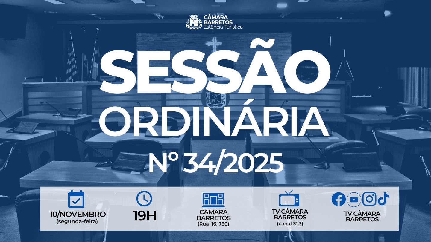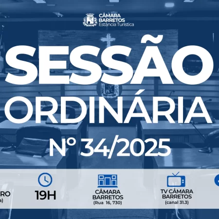 A Câmara de Barretos realizou na segunda-feira (10/novembro), às 19h, a 34ª Sessão Ordinária de 2025. Ao todo 9 matérias foram discutidas e votadas: 1 Parecer da Comissão de Justiça e Redação pela inconstitucionalidade, 3 Projetos de Lei Complementar, 3 Projetos de Lei e 2 Projetos de Decreto Legislativo.