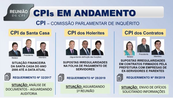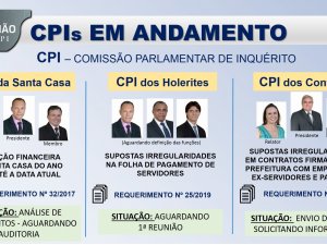 Três CPIs (Comissões Parlamentares de Inquérito) estão em andamento na Câmara Municipal. A CPI da Santa Casa (Requerimento nº 32/2017) foi instaurada em 2017 para apurar a situação financeira da Santa Casa desde o ano 2000 até a data atual. A CPI dos Holerites (Requerimento nº 25/2019) teve início em fevereiro de 2019 e tem como objetivo apurar supostas irregularidades na folha de pagamento de servidores da Prefeitura. Já a CPI dos Contratos (Requerimento nº 59/2019) investiga supostas irregularidades em contratos firmados pela Prefeitura com empresas de ex-servidores e parentes.