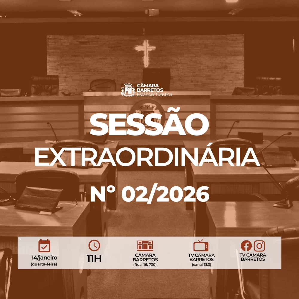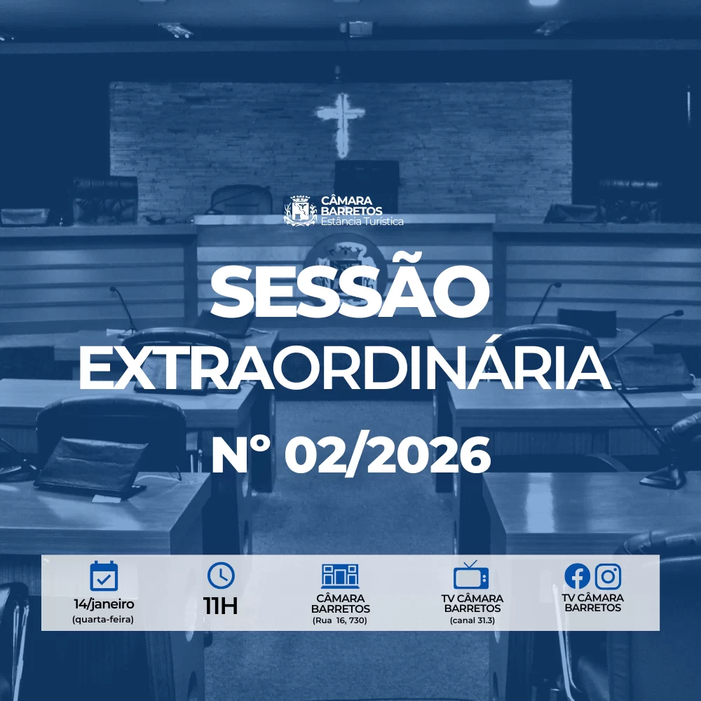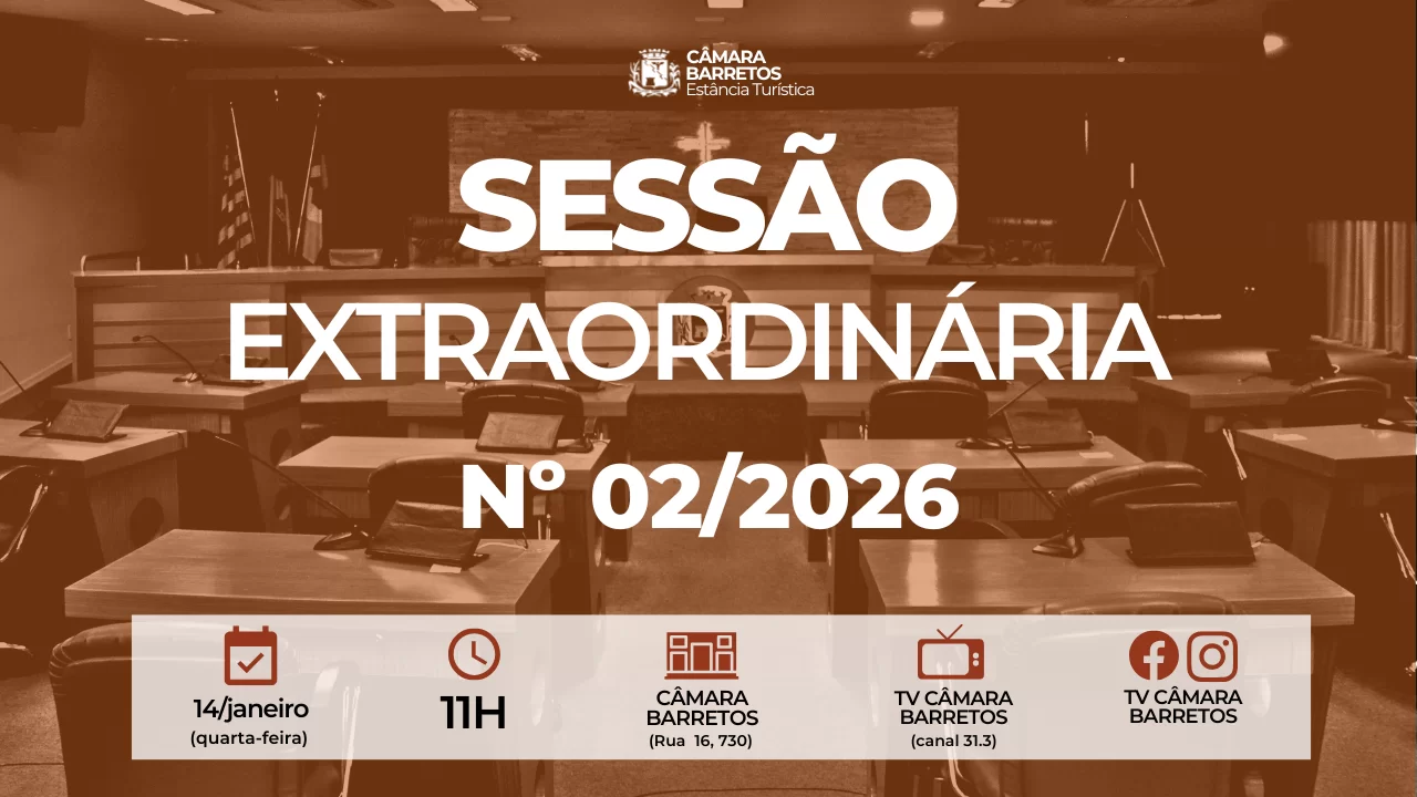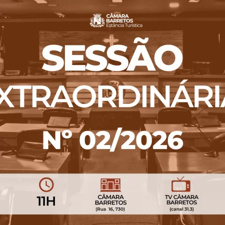 A 2ª Sessão Extraordinária de 2026 foi convocada por meio de edital da Presidência da Casa e contou com transmissão ao vivo pela TV Câmara Barretos, além das redes sociais oficiais do Legislativo.